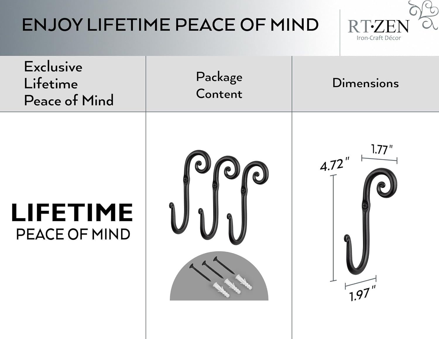 RTZEN Wall Mount Hook Set - Wrought Iron Decorative Rustic Metal Coat Hooks for Hanging - Handcrafted Classic Farmhouse Wall Mounted Black Hooks for Towel Robe or Hat Hanging - 3 Pack