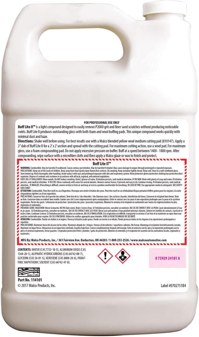- BEST USE: Apply a 2” dab of Buff Lite II for a 2’ x 2’ section and spread with the cutting pad. Buff at a speed between 1400 - 1800 rpm. After compounding, wipe surface with a microfiber cloth and then apply a Malco glaze or wax to finish and protect.