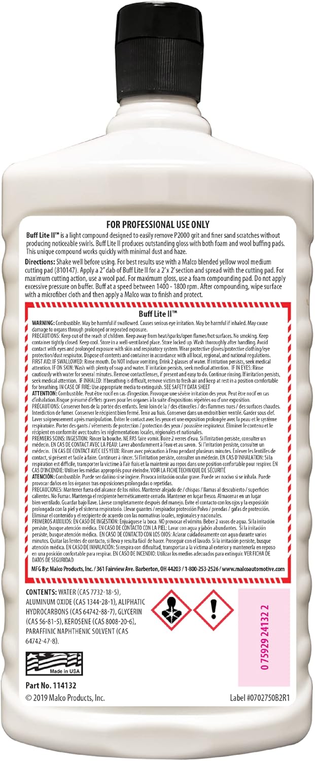 - BEST USE: Apply a 2” dab of Buff Lite II for a 2’ x 2’ section and spread with the cutting pad. Buff at a speed between 1400 - 1800 rpm. After compounding, wipe surface with a microfiber cloth and then apply a Malco glaze or wax to finish and protect.