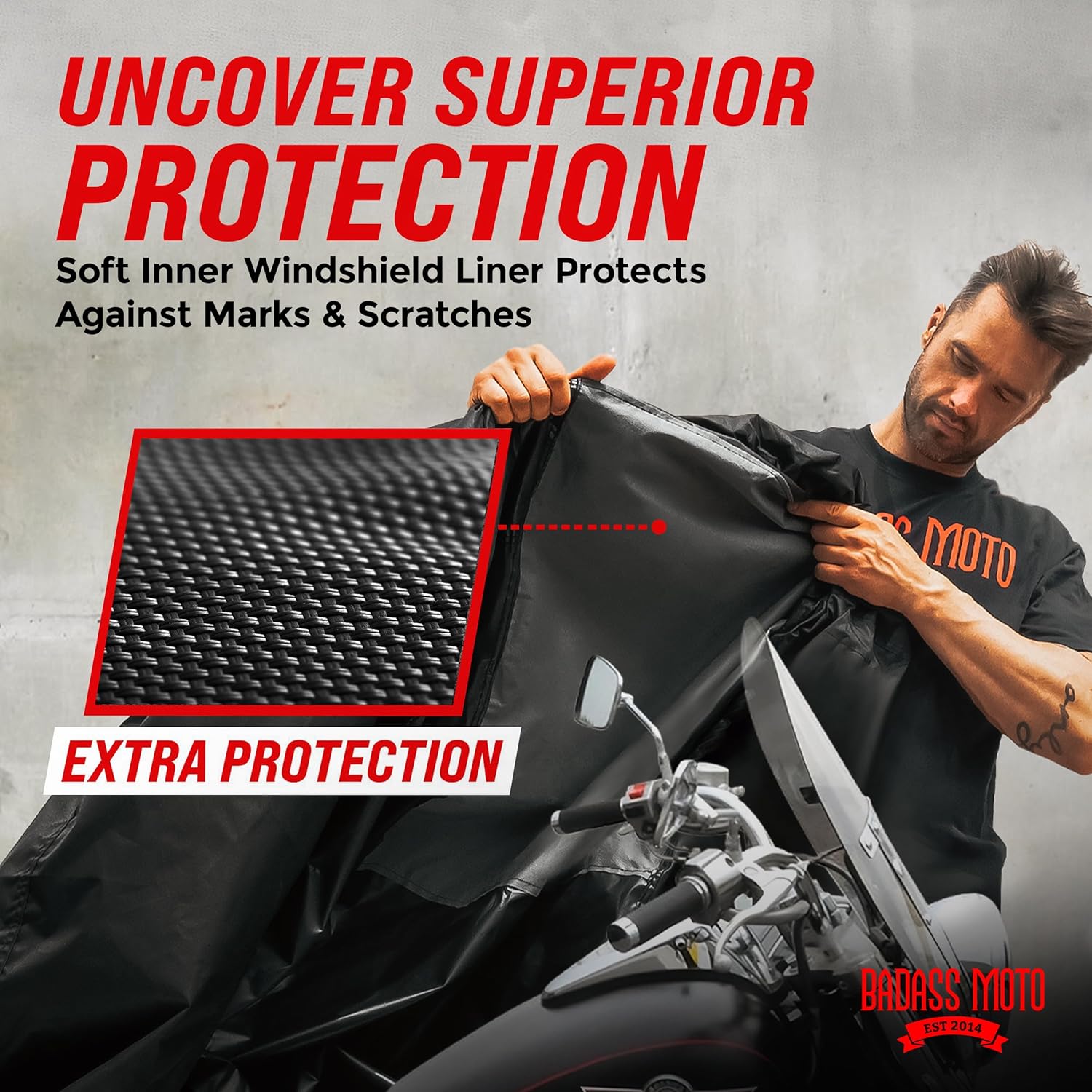 Badass Moto Ultimate Motorcycle Cover Waterproof Outdoor Heavy Duty Durable All Season Storage Harsh Weather Sun Rain Cover fits Harley Davidson Street Glide, Vulcan, Shadow, Cruiser Bikes. Large 97L