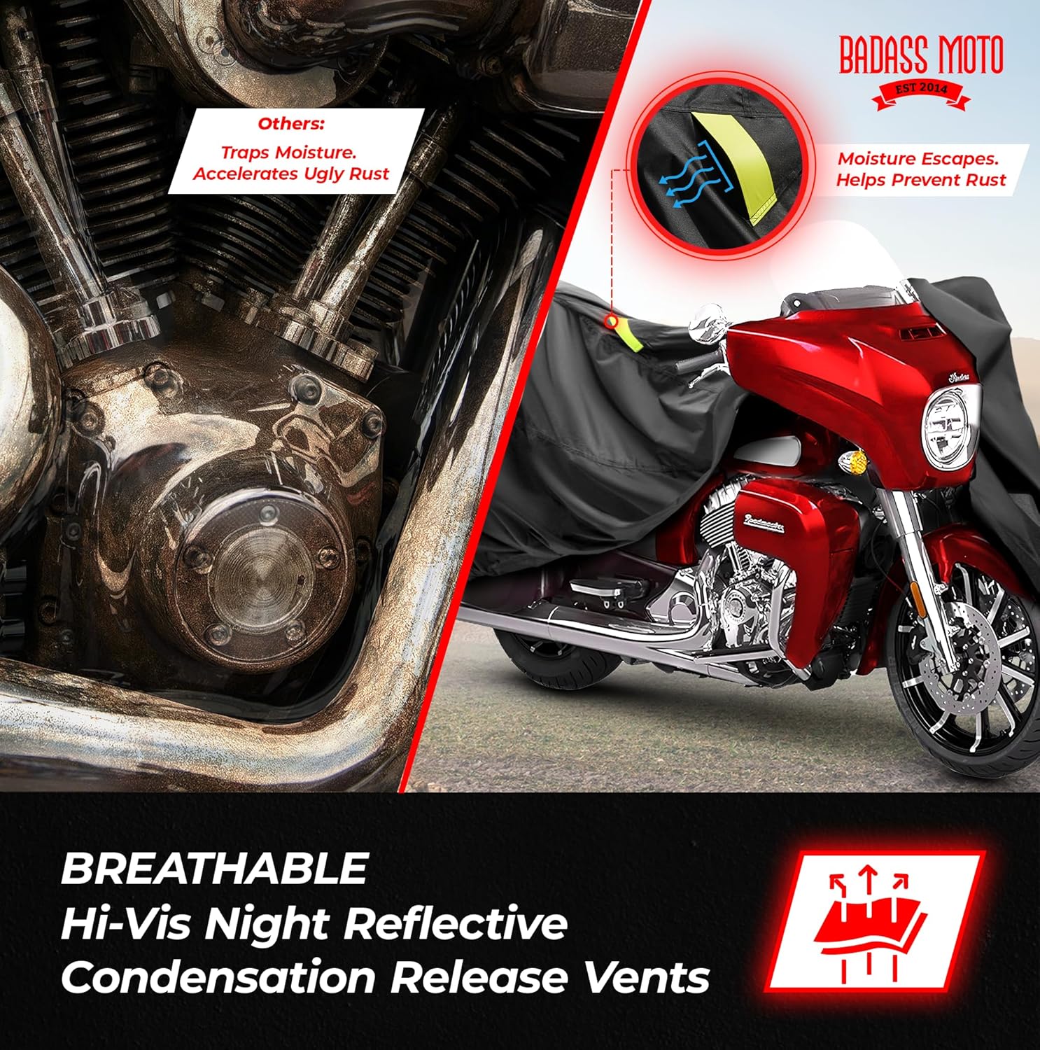 Badass Moto - Extra Large Motorcycle Cover Waterproof Outdoor, Heavy Duty, for Harley Davidson, Night Reflective (108” Full Dressers,Tourers) X-Large