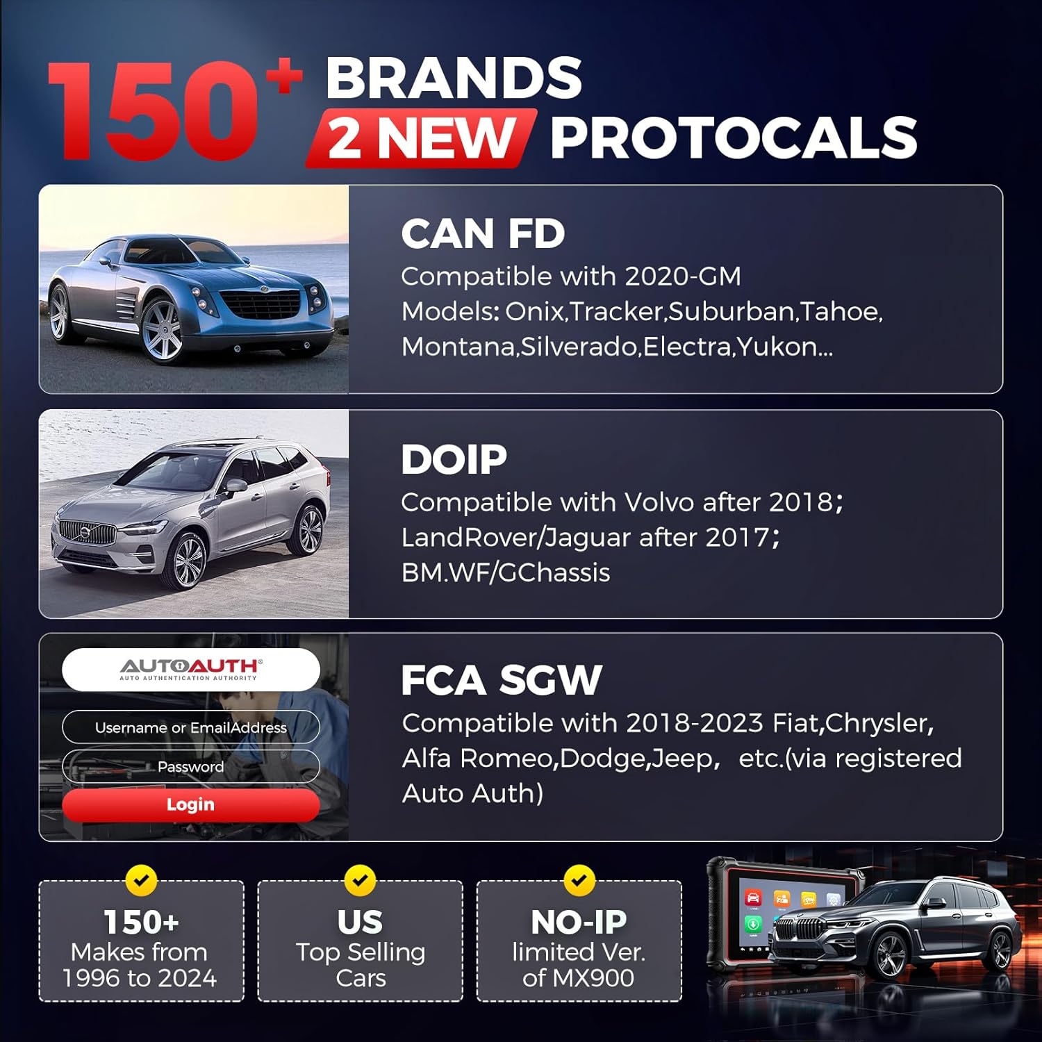 - đăNEW DoIP & CAN-FD, 150+ Brands CoverageăYou can always trust Autel scanners: #1 car coverage in industry, superior to most scanner automotriz. If you work on diverse makes/models worldwide, this 2025 Autel MK900 will satisfy you. Itâs got the same vehicle coverage as high-end Autel scanners value at 2000 bucks: 150 brands (EU/US/Asian), US top-selling models (1996-2025), FCA & Renault SGW, DoIP & CAN-FD (won't see in equal-level bidirectional scan tools). NO-IP limited version of MX900.