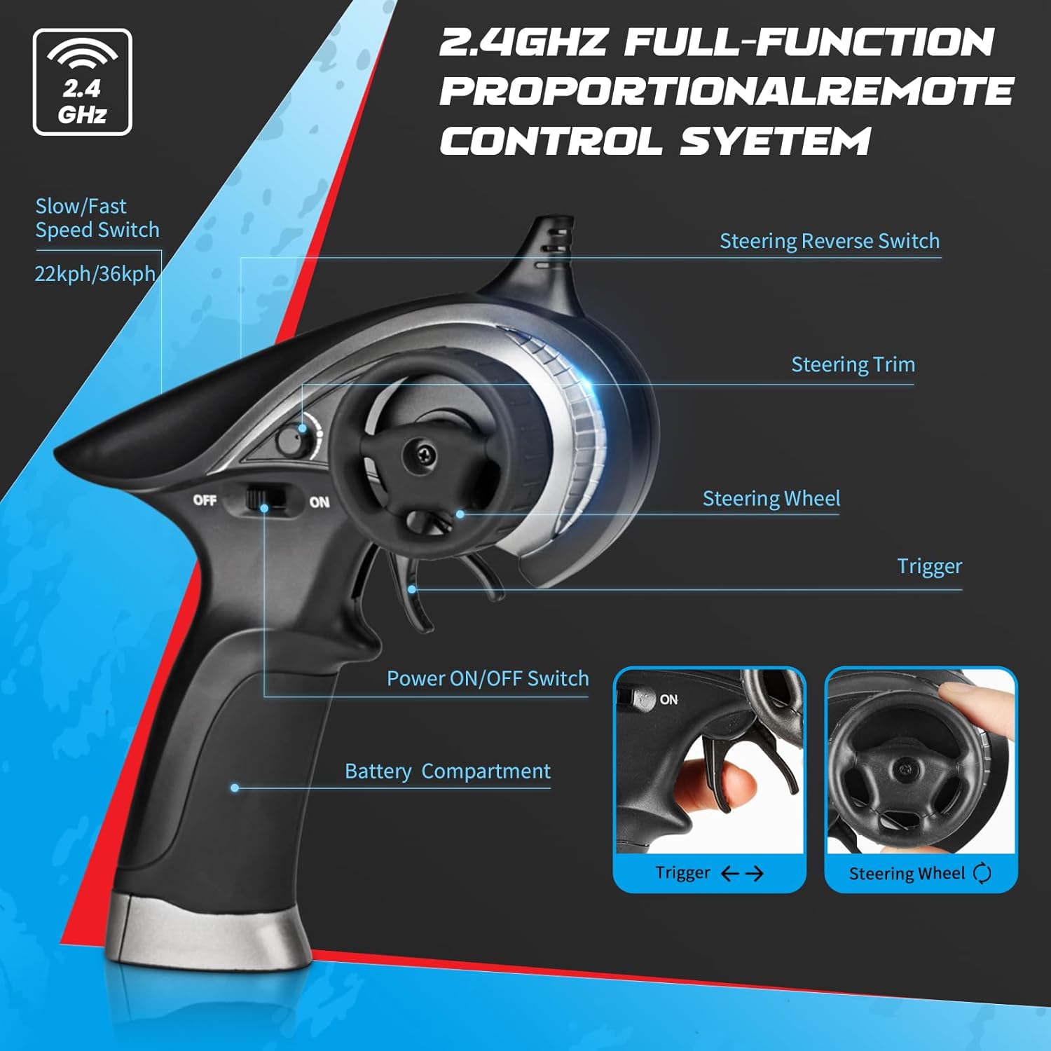 - Powered with superb and fast brushed RC 380 motor in unceasingly efficient drivetrain , this 4WD rc trucks speeds topping to 36 KPH, which finds operators in marvelous enjoyment.