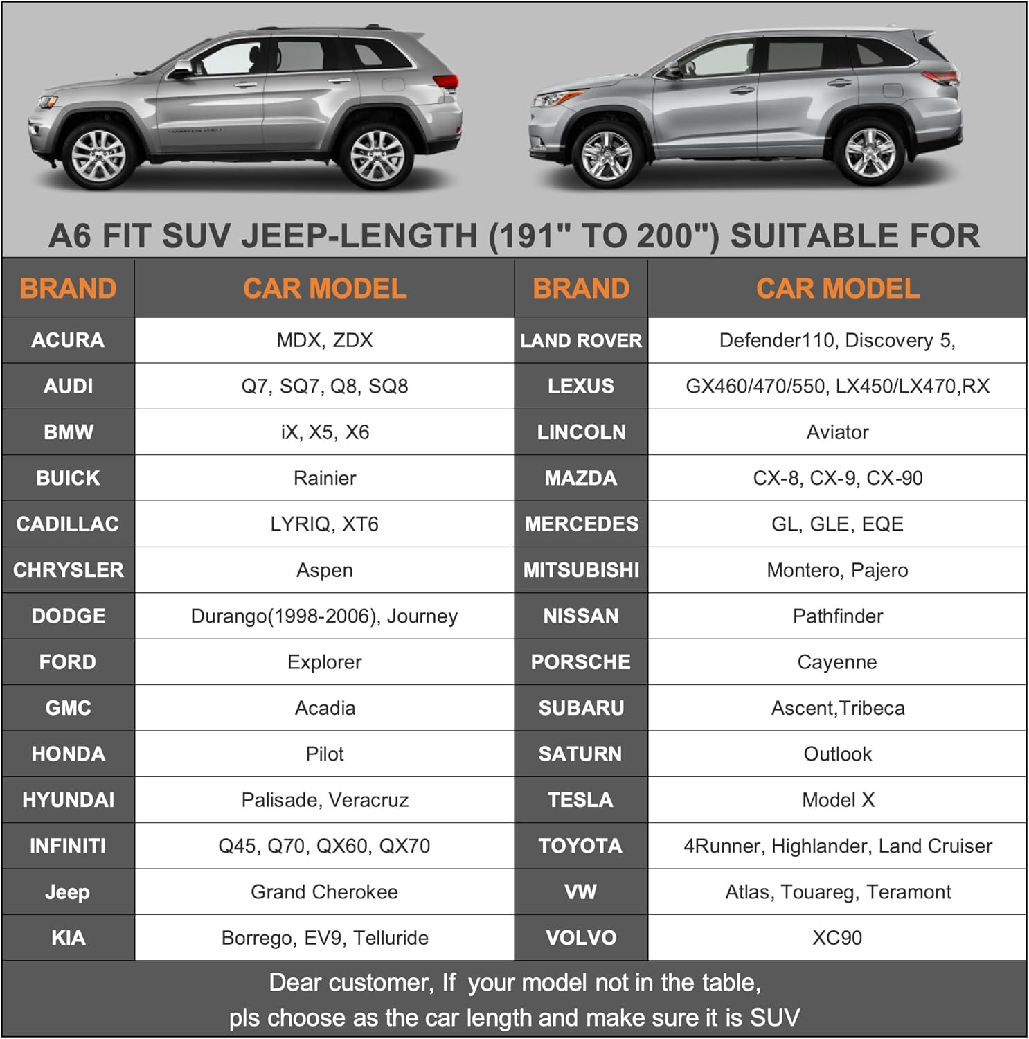 - 【Dimension A6】Universal fit for Suv which length is 191-201 inch (Not for hatchback and sedan). Suitable for Toyota Highlander/Land Cruiser, Honda pilot, Acura Mdx/Zdx, Cadillac XT6, Lexus RX/LX, Infiniti FX/QX60/70, Kia Telluride, Hyundai Palisade/Veracruz, Nisan Pathfinder, Porsche Cayenne, Audi Q7/Q8, BMW X5/X6, Mercedes GLE, VW Atlas/Touareg, Tesla Model X etc.