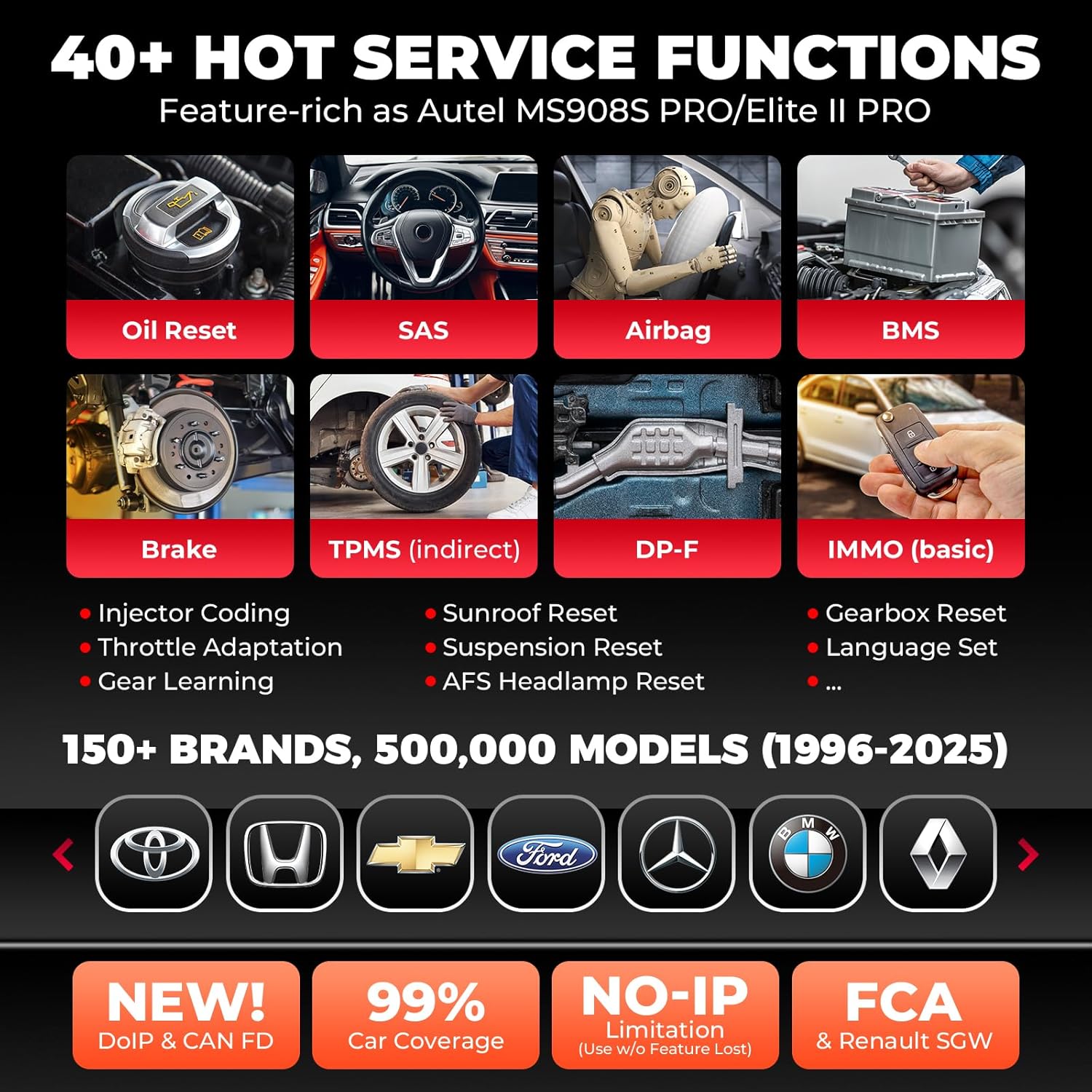 - đ„ă40+ Hot Services & CAN-FD, DoIPăSame as MS908S PRO II, ElITE II Pro, MSUltra, Autel most cost-effective scanner MP900-BT Kit also has 40+ menu-guided service: Oil Reset/SAS/EPB/BMS/DP-F/Throttle/ABS and 2025 newly-added SUS/ADBLUE/EGR/NOX/Headlamp resets. The #1 extensive field-tested database allows these 40+ functions to be effective on worldwide models even CAN-FD & DoIP-compliant cars, much better than many other escaner automotriz professional that have limited coverage and functions.