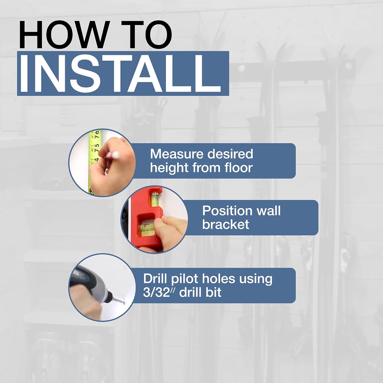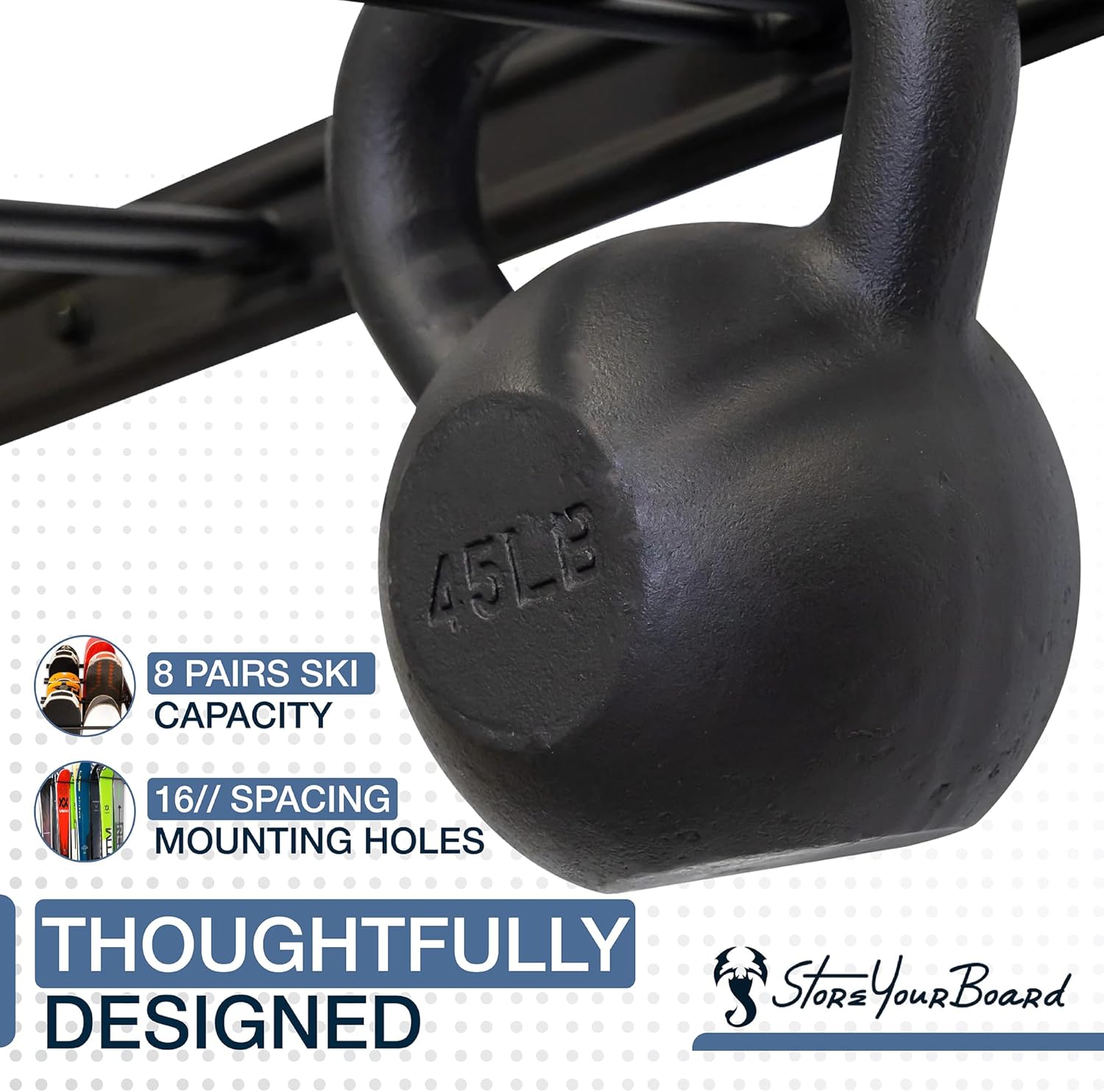 - Heavy-Duty Ski Rack For Garage: Wall-mounted ski storage rack holds up to 8 pairs of skis to keep your gear off the ground and organized. Ideal for garage ski storage, ski shops, condos, and basements.