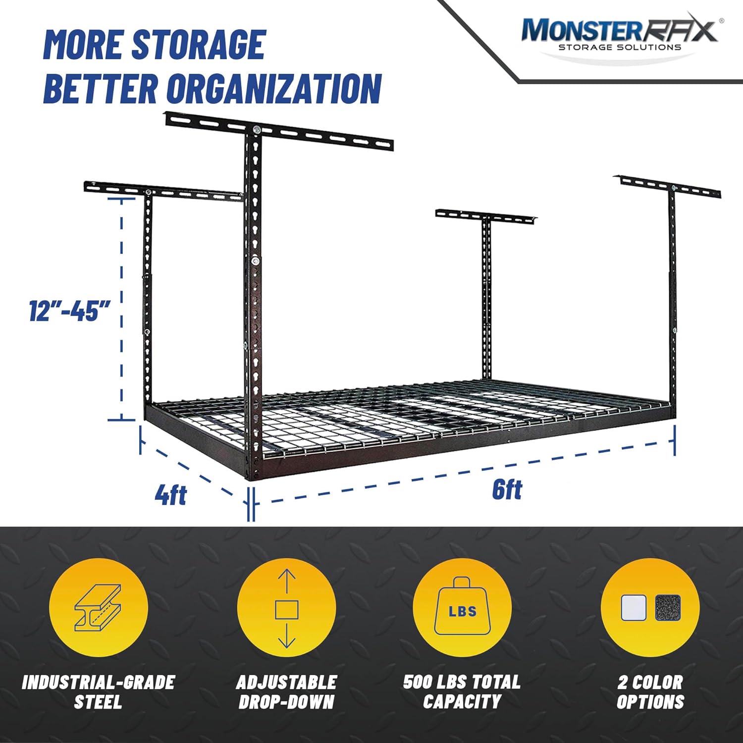 MonsterRax Overhead Garage Storage Racks 4x6, Ceiling Mounted Shelving, Adjustable Hanging Storage Organizer, Heavy Duty Steel, Holds 500 Pounds, Color: Hammertone, Adjusts 12"-21” off Ceiling