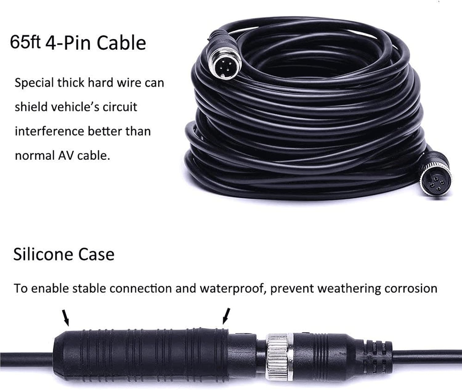 - 【Backup Camera Kit With Extended Aviation 4 Pins Connector Cord】Strong anti-interference, more close connection, easy to install. Special thick hardwire can shield vehicle’s circuit interference better than normal AV cable