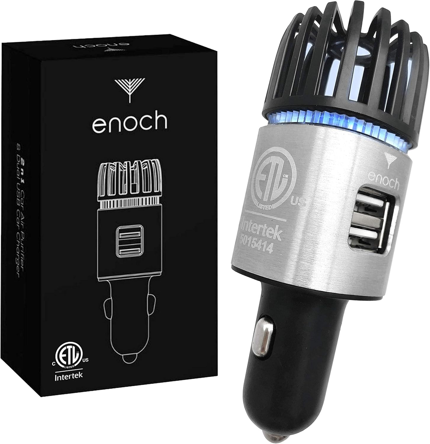 Enoch Car Air Purifier Premium Air Ionizer - 12V Plug-In Ionic Ozone Deodorizer Accessory with Dual USB Car Charger - Eliminates Cigarette Smoke, Pet and Food Odors, Dust (Gray Silver)