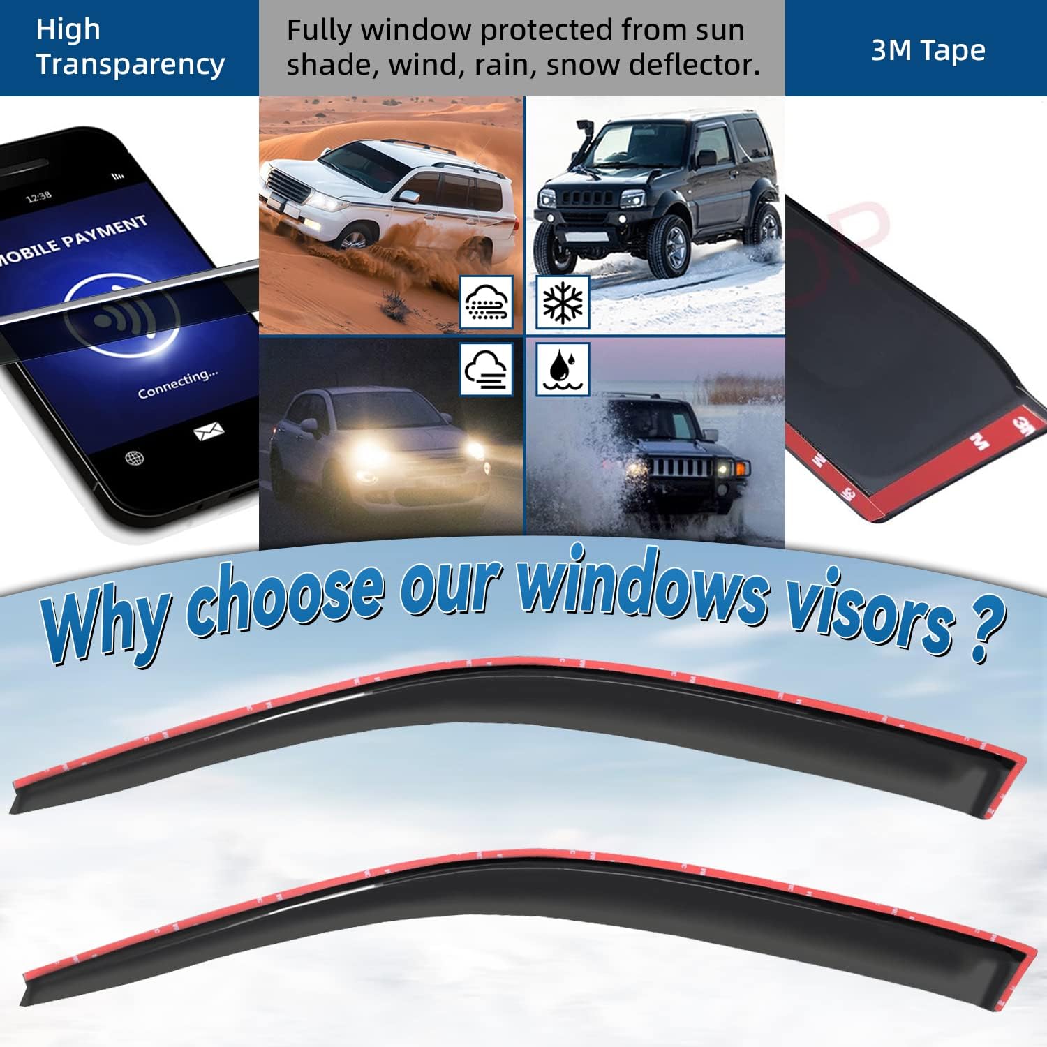 - Package Included: 2pcs front vent shade window visors (3M Tape Included)