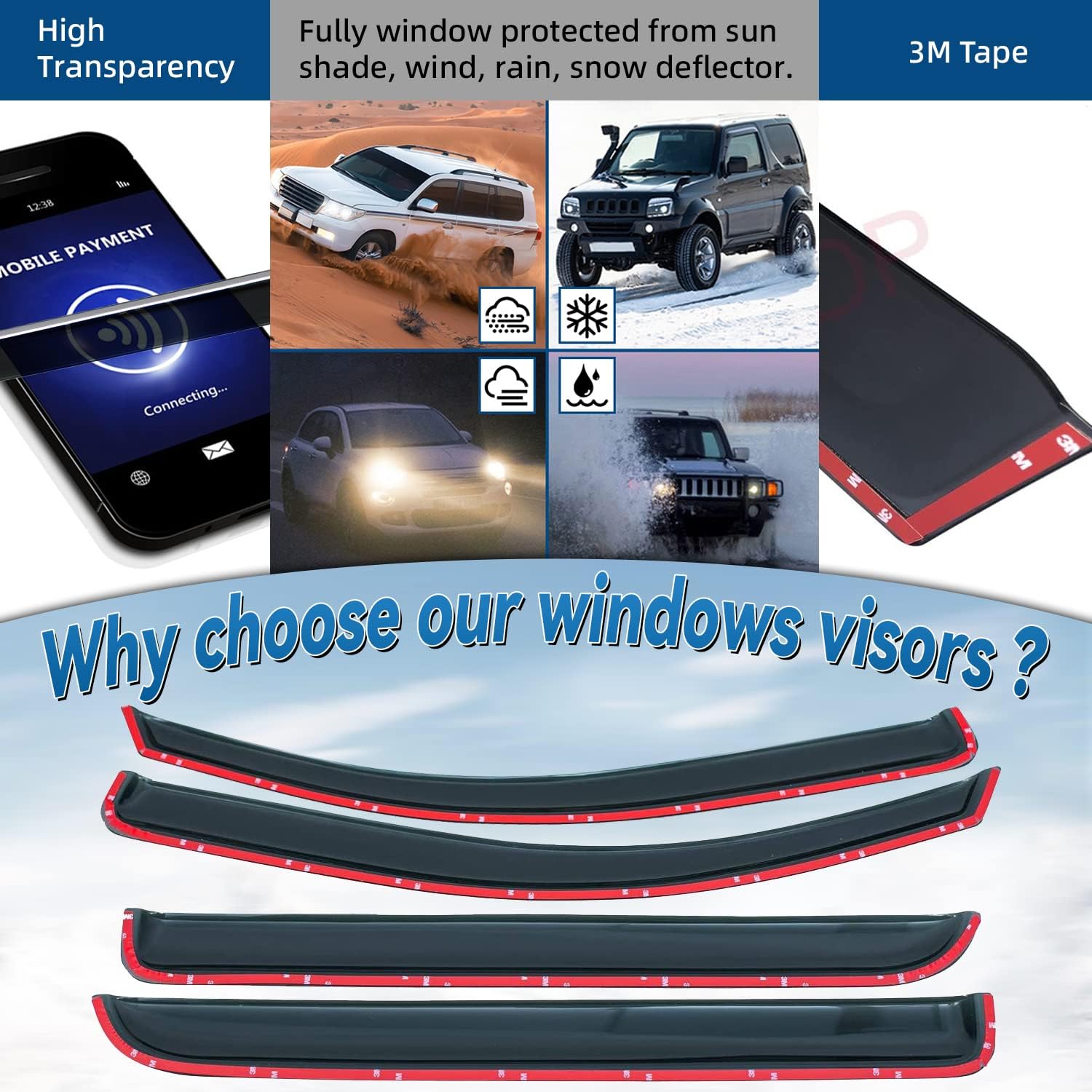 - Package Included: 4pcs front + rear vent window visors (3M Tape Included)