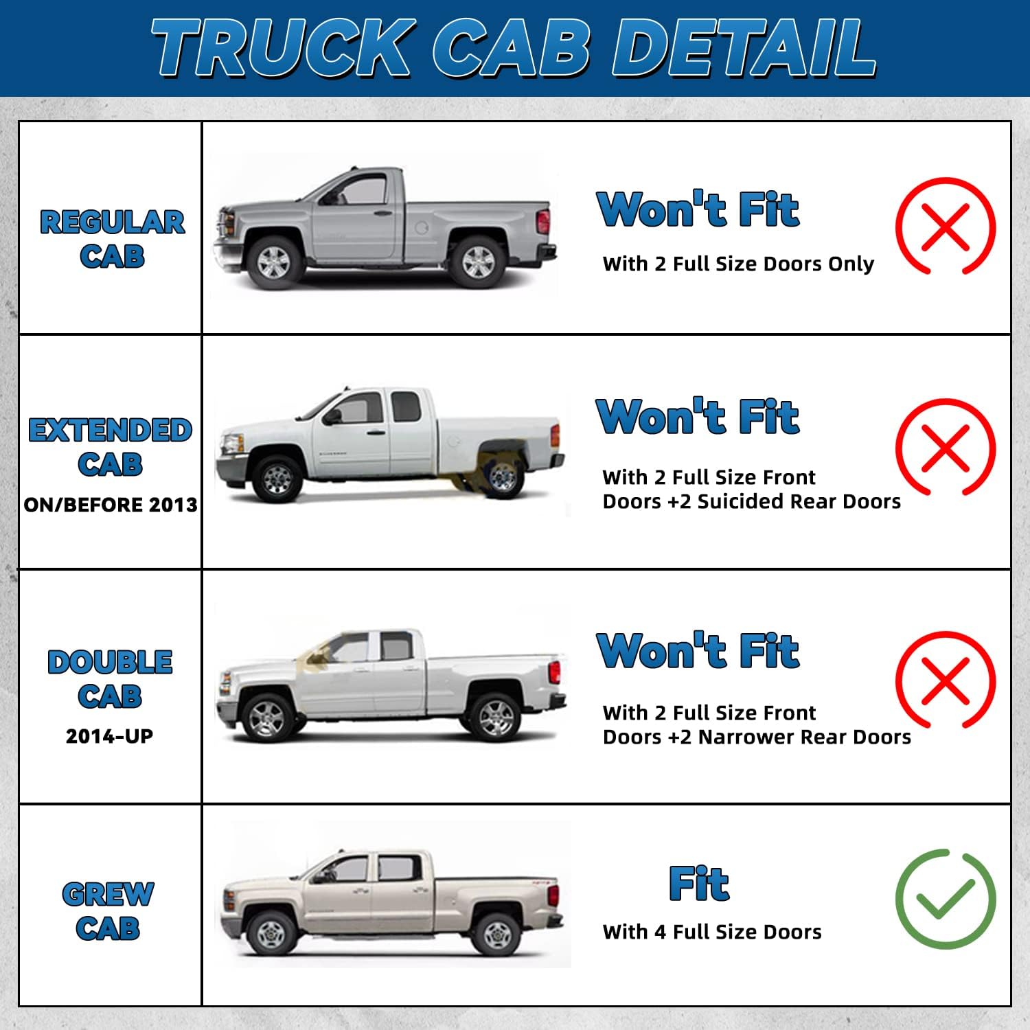 - Fit: 2014-2018 Chevy Silverado/GMC Sierra 1500 Crew Cab With 4 Full Size Doors; 2015-2018 Chevy Silverado/GMC Sierra 2500HD/3500HD Crew Cab With 4 Full Size Doors Only