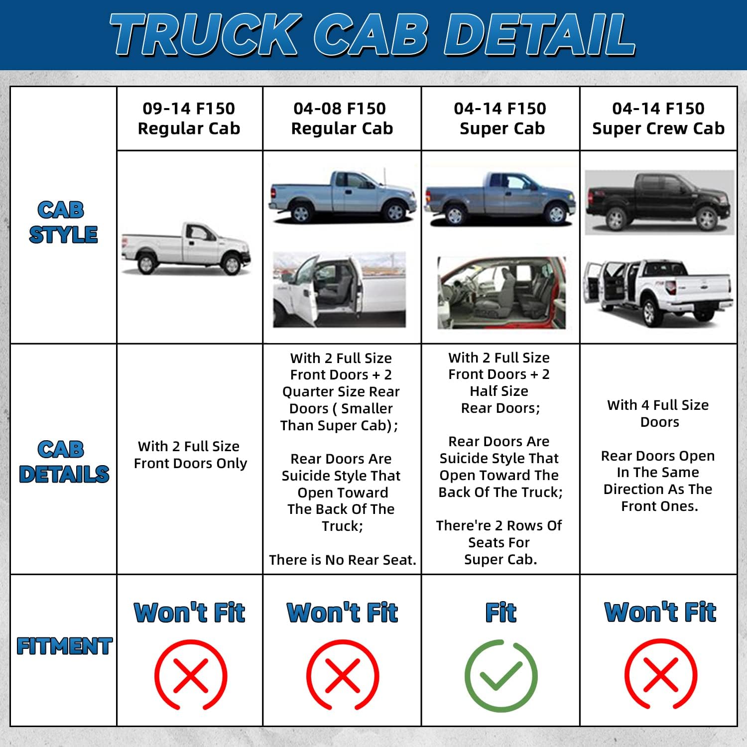 - Fit: 2004-2014 Ford F150 Extended Cab (AKA Super Cab) Only (Note: Extended Cab has 2 Full Size front doors + 2 Half Size suicide style rear doors, and it has back seats as well. Please make sure your pickup is the correct cab that this item will fit!)