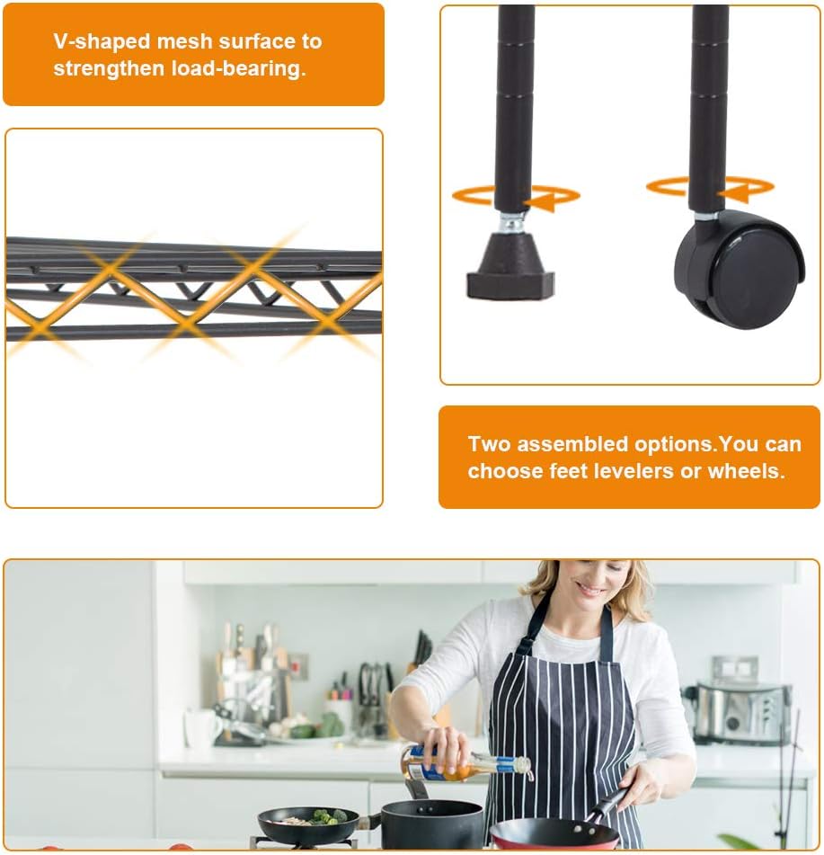 - √【LARGE AND STURDY】:The wire shelving unit provide an enormous amount of space and strong shelves. The metal shelf doesn't occupy too much space,but it can create more additional space. The storage shelves use durable steel construction,and to resist dirt buildup and corrosion. Maximum weight capacity per shelf is 150lbs when equally distributed on feet levelers.Maximum entire unit weight capacity is 220lbs when equally distributed on casters.wire shelving unit metal shelf storage shelves.