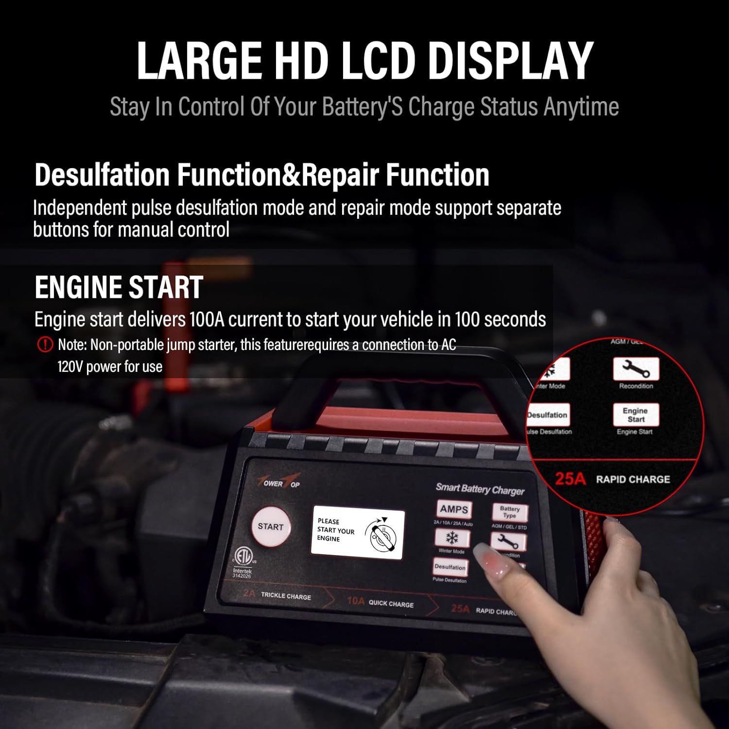 - HD LCD Screen and 8-Stage Intelligent Charging: With true 8-stage smart charging (desulfurization, soft start, bulk charge, absorption, analysis, repair, float, and pulse maintenance), it optimizes battery life and repairs batteries without overcharging or damaging them. The HD LCD screen allows you to view the charging stage and parameters at any time rather than leaving you guessing, keeping you informed of the charging status