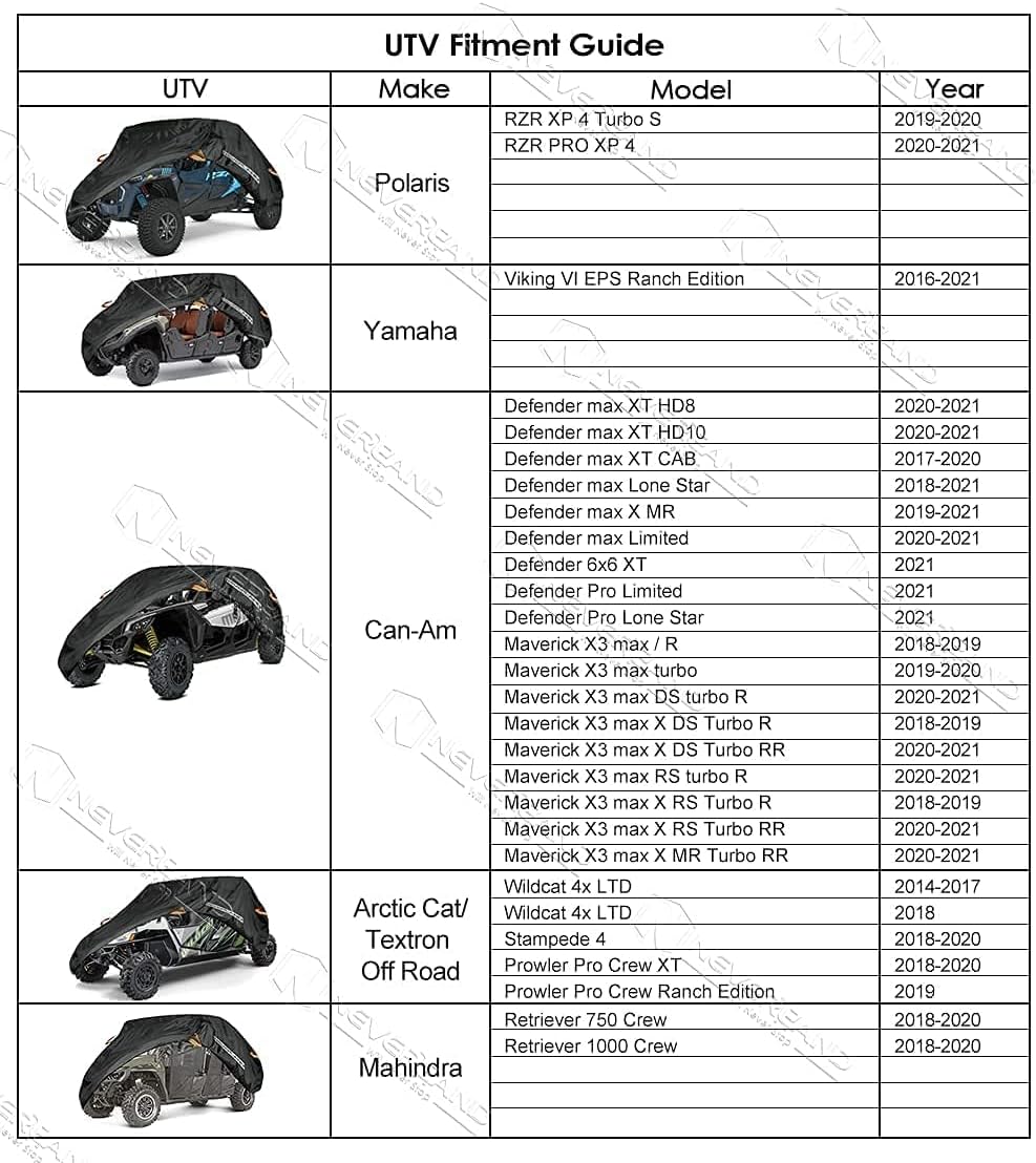 - APPLIANCE: Made with 300D denier oxford cloth ,aterials for ourdoor & indoor.NEVERLAND UTV Cover fit for Can-Am Maverick X3 Yamaha Arictic Cat Textron off Road and so on. Can use in Summer and Winter
