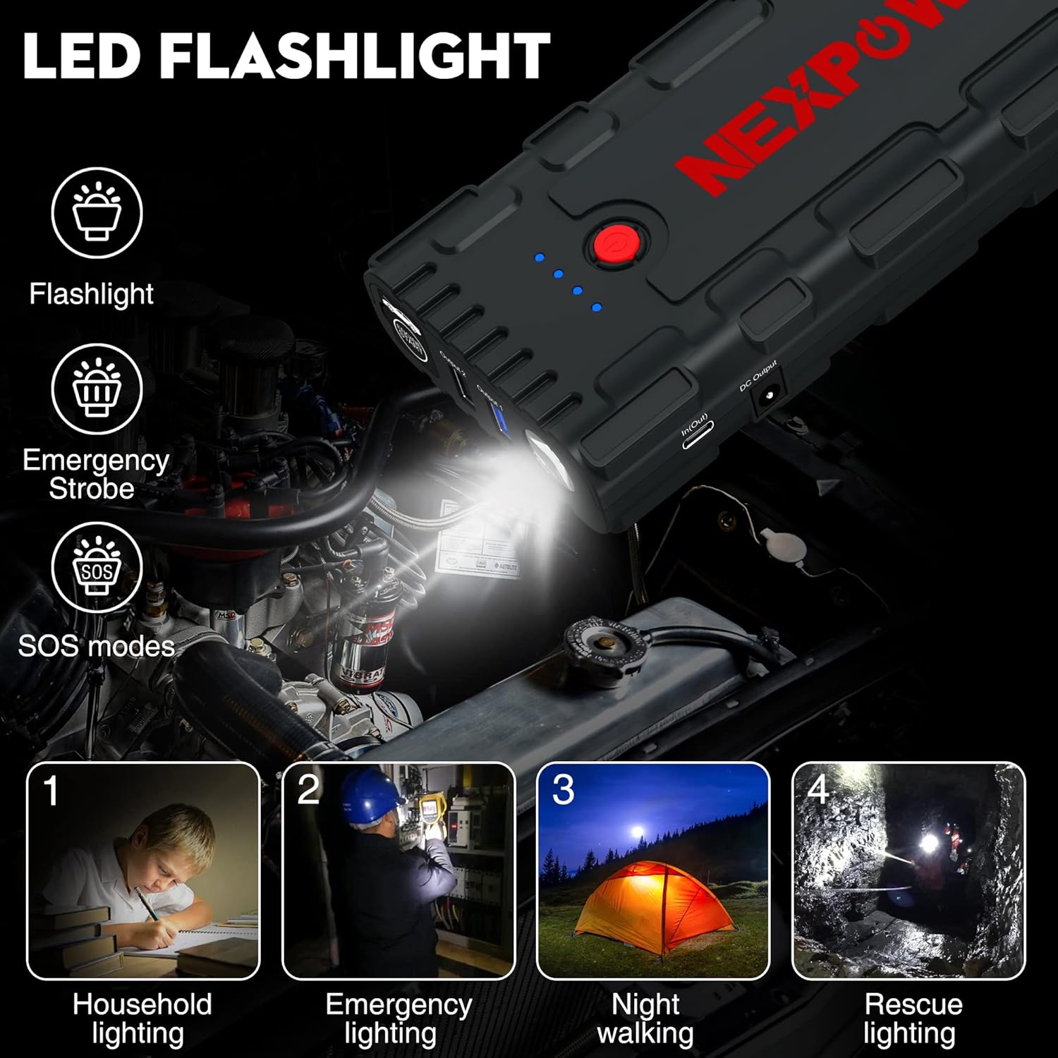 - 【IMPROVED SAFETY TECHNOLOGY】NEXPOW portable car battery jump starters have Intelligent jump cables built-in 8 upgraded protections, particularly spark-proof, reverse polarity protection, high-temperature protection, over-load protection. The car battery jump box/jump cable flashing light and beep will tell you wrong operations.