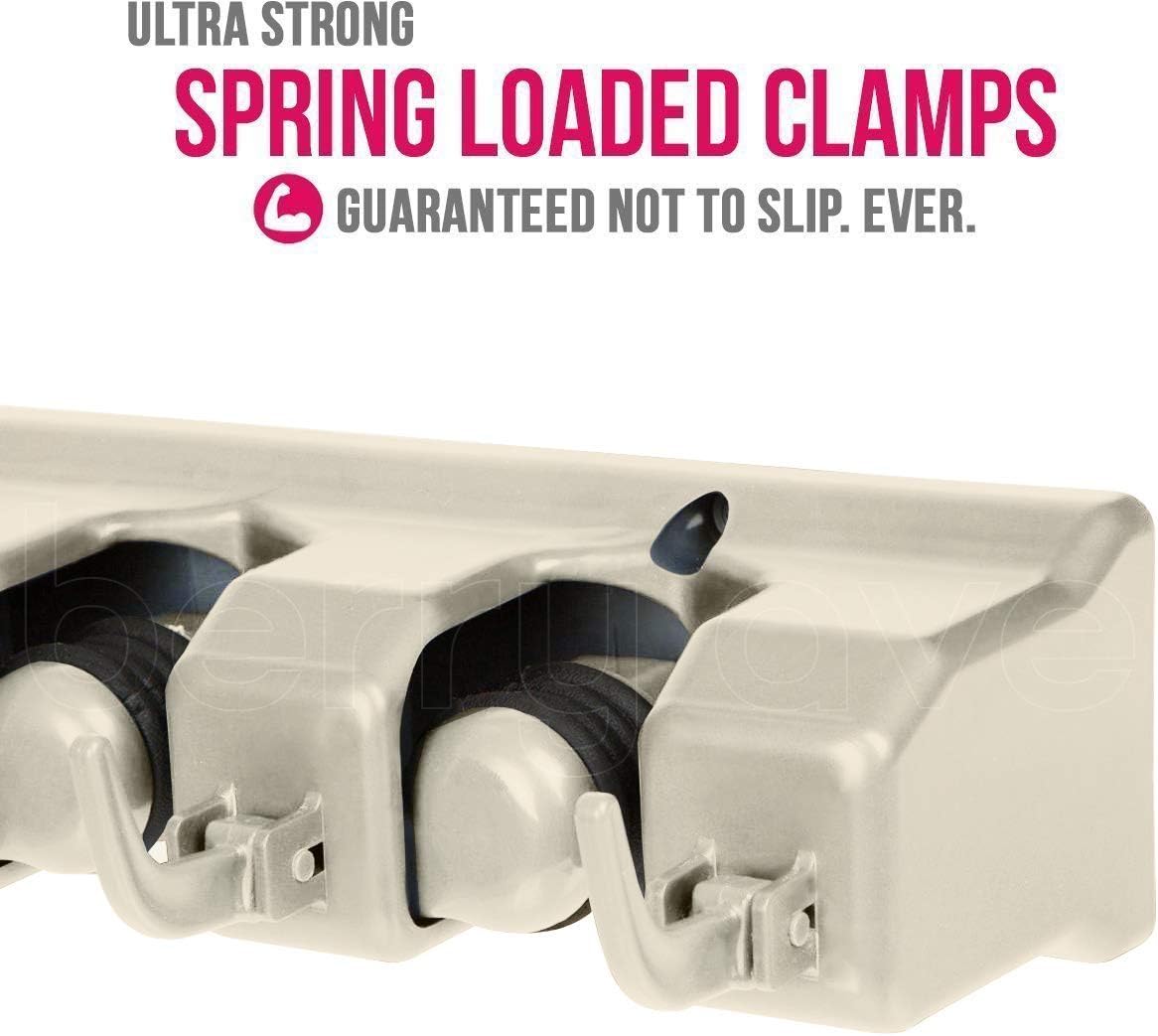- NO SLIDE, NO MESS – Each commercial grade broom hanger has a 35 pound holding capacity. Thanks to the spring loaded, double rubber gripped slots, the Berry Ave utility hooks can hold anything from wet mops and dirty rakes to baseball bats, without any annoying slipping.