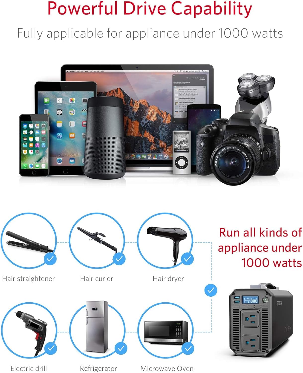 - Pure sine wave inverter: Superior to modified sine wave inverter, greater drive capability,better protection to sensitive equipment, less audible and electrical noise, less power consumption. Great for supporting medical devices (CPAP, Lift, Power Wheelchair, nebulizers) in the event of a power outage, as well as power other small appliances/devices such as coffee maker, projectors, TV, speaker, air conditioner, microwave, mini-refrigerator.