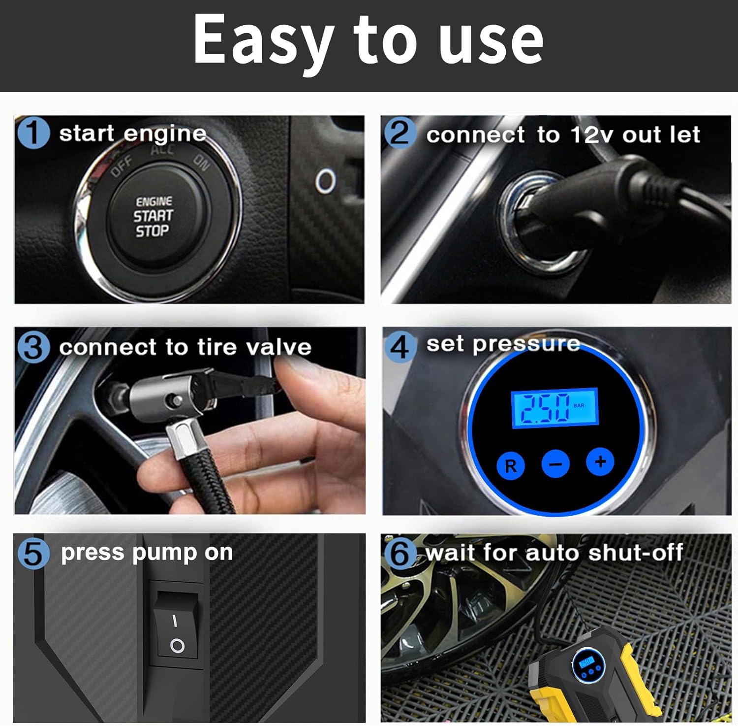 - 【150PSI MAX WORKING PRESSURE】:With maximum pressure 150 PSI and air flow 35L/min, it can inflate the 195/65/R15 car tire from 0 to 35psi under 5 minutes. It's much faster and more effective than traditional pumps, and comes with an accurate tire pressure gauge.