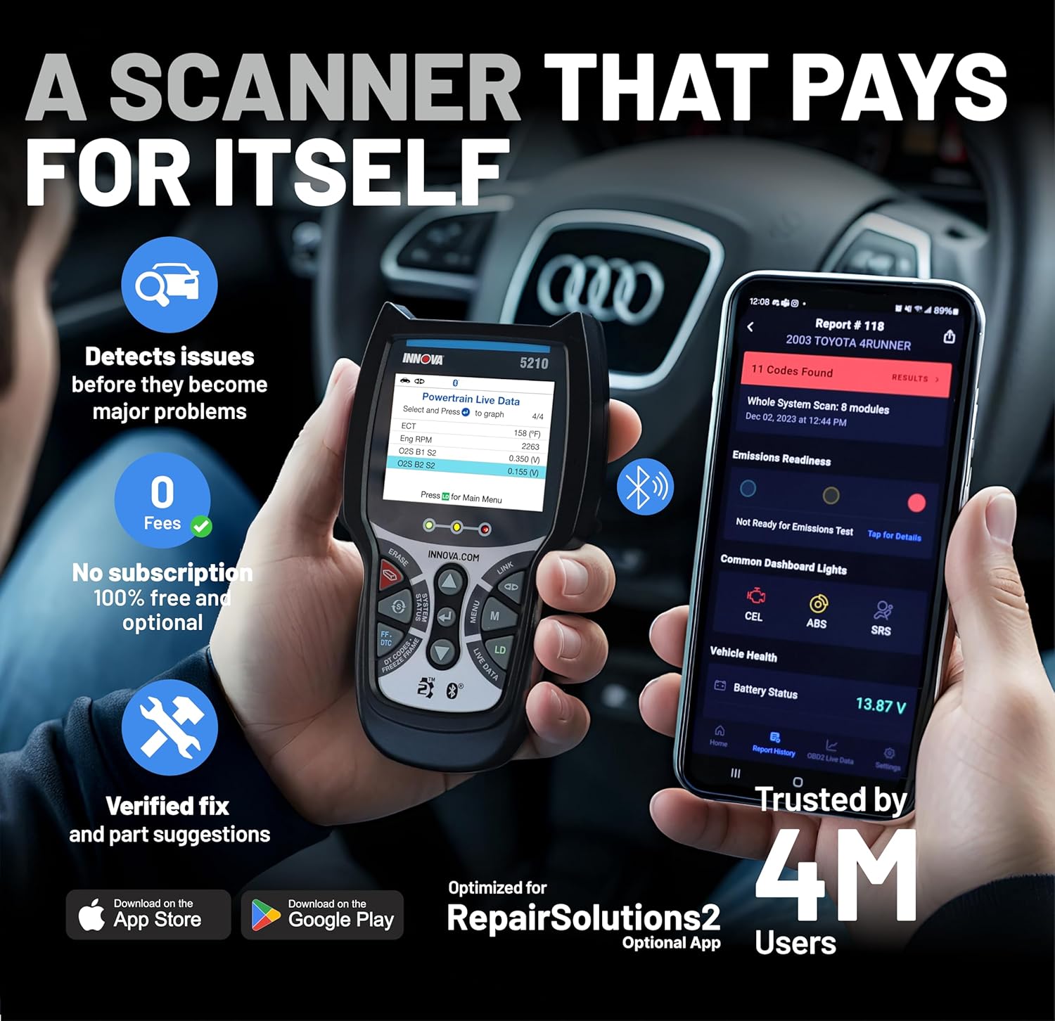 - NO SUBSCRIPTIONS – VERIFIED FIXES WITH FREE APP – Unlike other OBD2 code readers, the INNOVA 5210 provides verified fixes based on real-world repairs from ASE-certified mechanics. Trusted by 4M users, the RepairSolutions2 app on iPhone & Android gives you step-by-step repair guidance, suggested parts, and cost estimates—no extra fees or hidden subscriptions!