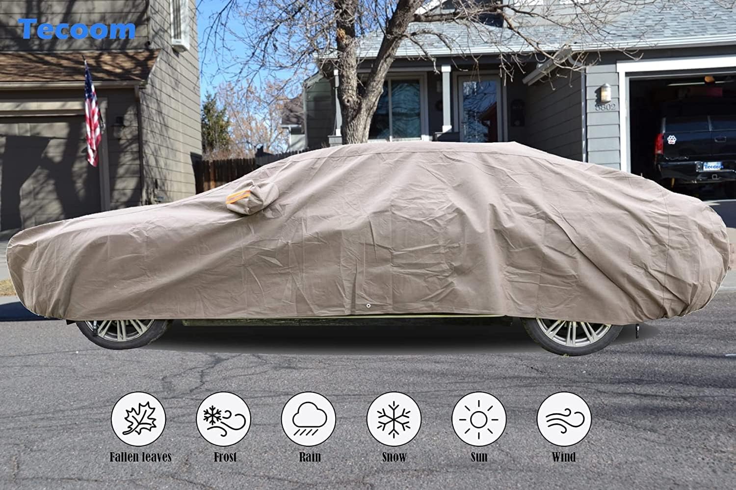 - WATER & WEATHERPROOF: Whether its rain, snow, or a dust storm, you never have to worry about your car getting dirty with Tecoom 3 layer car covers. Thanks to the waterproof materials which coupled with the breathability of the fabrics, Tecoom car covers prevent water from seeping through to make sure your car stays dry even after it rains.