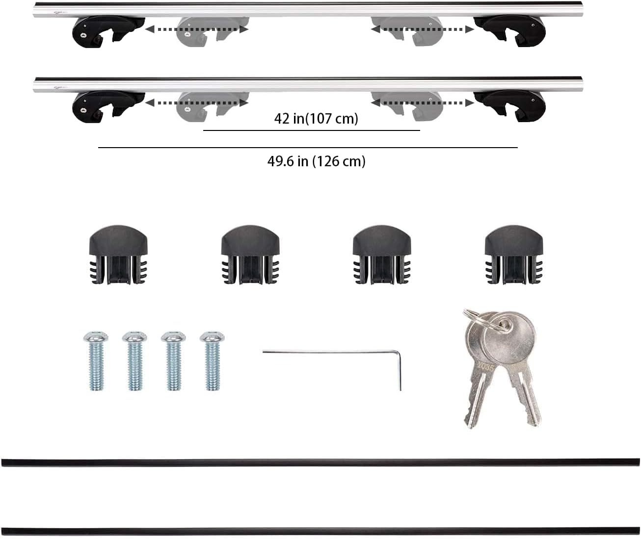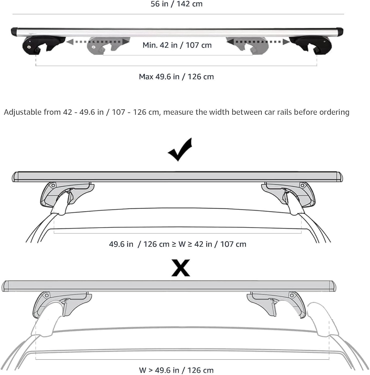 - Please verify the roof rack's compatible dimensions before making your purchase.56-inch long cross rail roof rack mounts to most cars, SUVs, or crossovers with raised longitudinal rails, gap between rail and car roof must be 1/2 inch (1.3cm) and above, distance between two rails must be bigger than 42 inch (107cm) and smaller than 49.6 inch (126cm) , diameter of rail must be within 1.4-2.1 inch (36-55mm). Vehicle fit found in Product Description below.