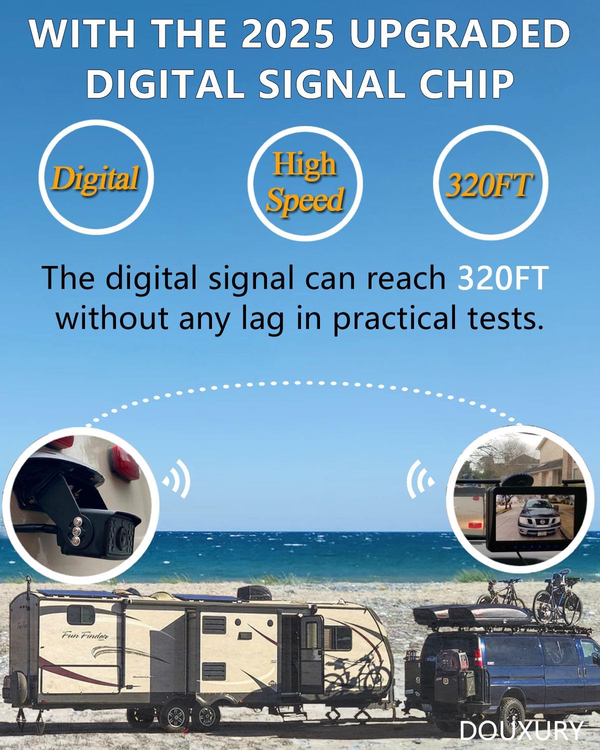 - Upgraded Wireless Backup Cameras: With unique dual antenna design and the latest digital signal chip, the wireless Backup Cameras can send 1080P videos to the display via the stronger signal. The signal can reach 320ft in open areas and 180ft in vehicles
