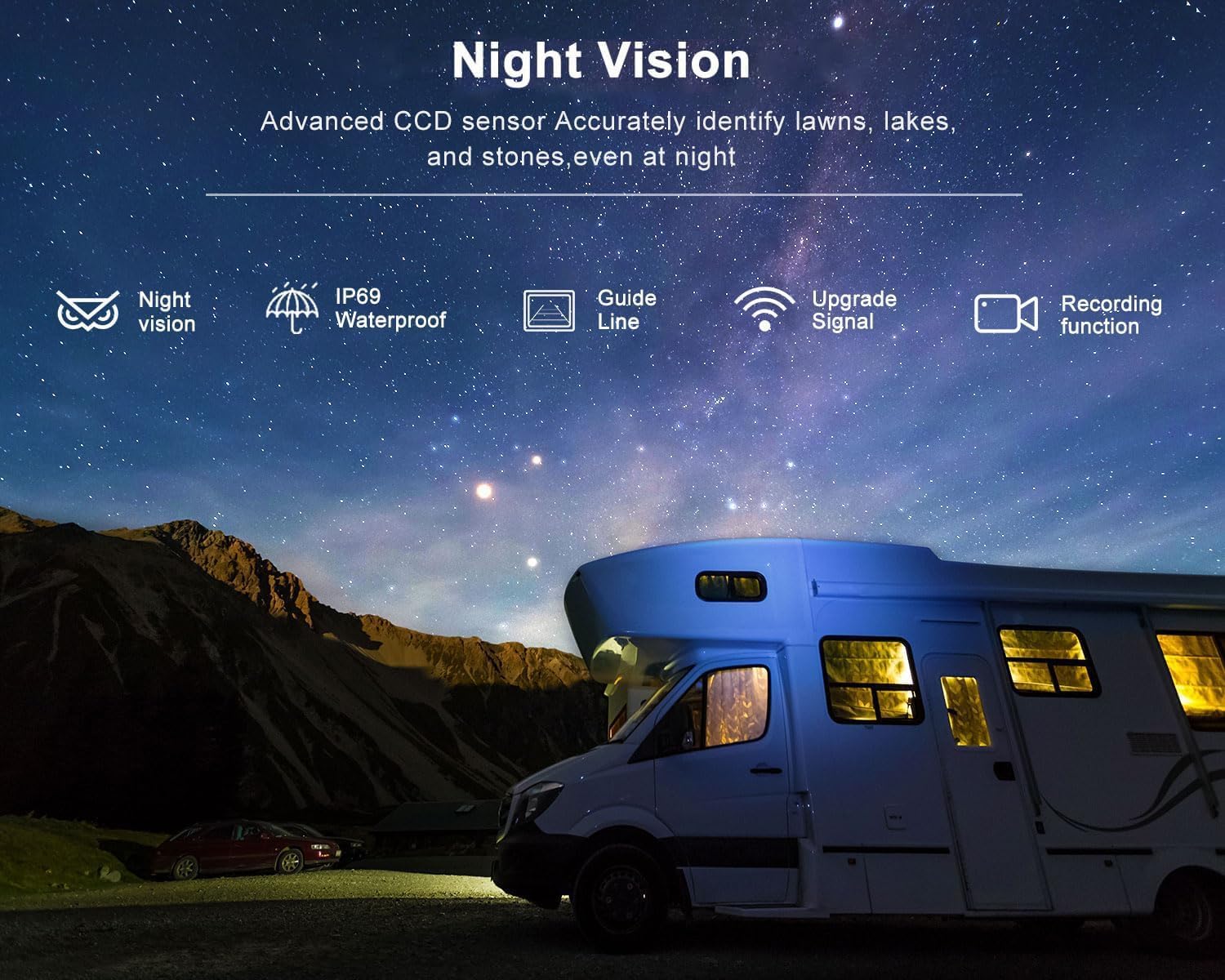 - đăNight Vision & IP69 Waterproofă Infrared LEDs + CCD sensor detect obstacles in darkness (lawns, curbs, debris) *Clean camera lens periodically for optimal night vision. The IP69-rated metal-sealed housing resists rain, snow, dust, and extreme temps (-4°F to 158°F), provide you all day intimate monitoring.