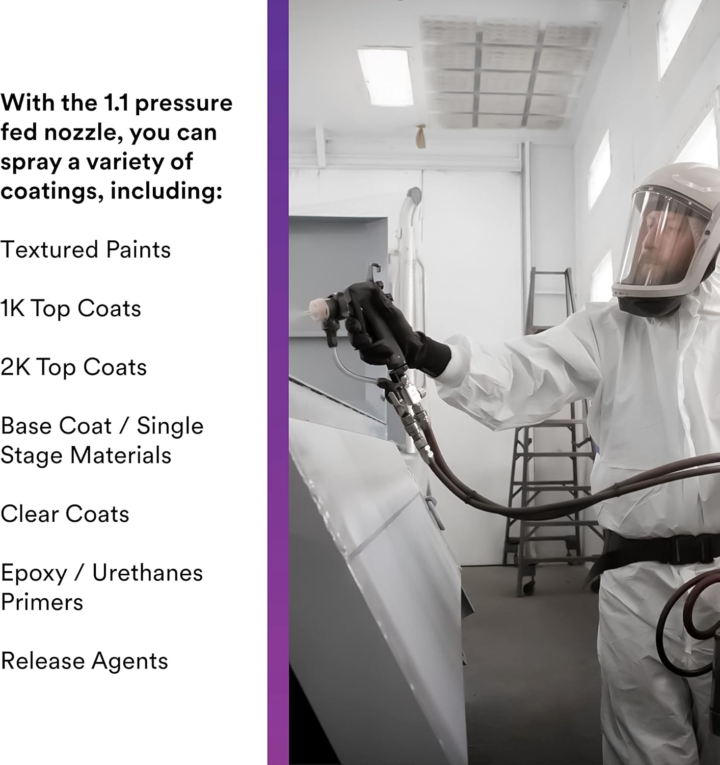- VERSATILE: 1.1 Size nozzle ideal for textured paints, 1K top coats, 2K top coats, base coats, single stage materials, clear coats, epoxy and urethane primers, adhesives and release agents