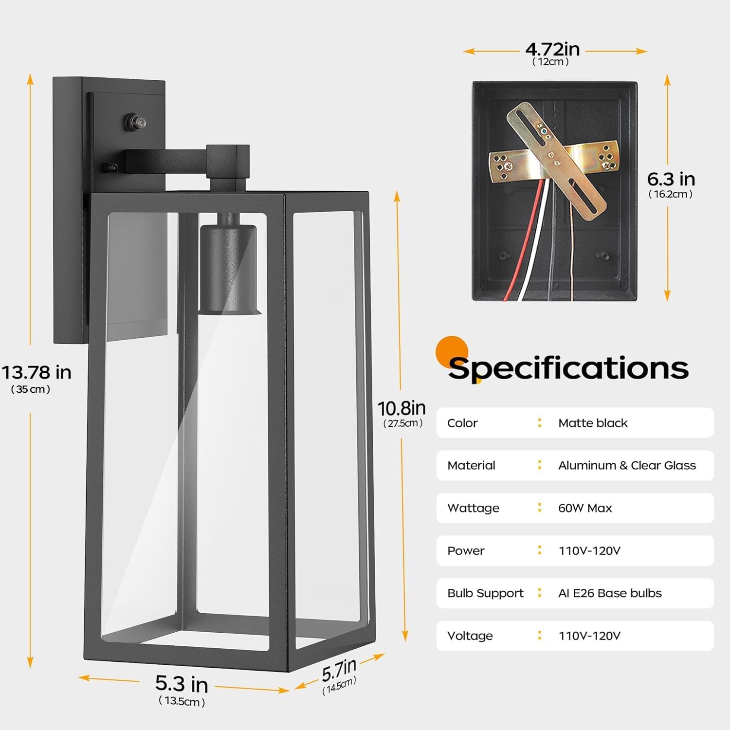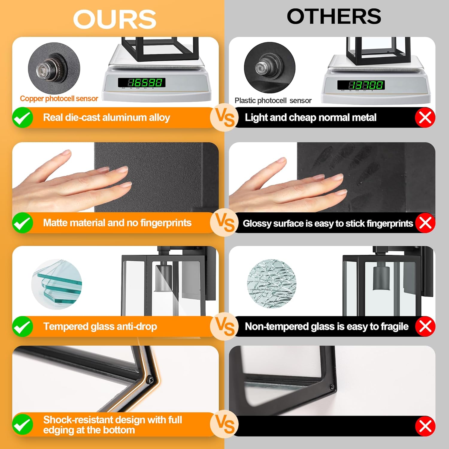 - đăAnti-Rust & Weather ResistanceăMade of the heavy-duty die-cast aluminum alloy, our exterior light fixtures is high waterproof rated, seamless connection, anti-rust, and anti-corrosion. No matter rain or snow, ultra-high or low temperatures, this dusk to dawn outdoor lighting can still keep stylish looking after years of using, no worries about the aging problem.