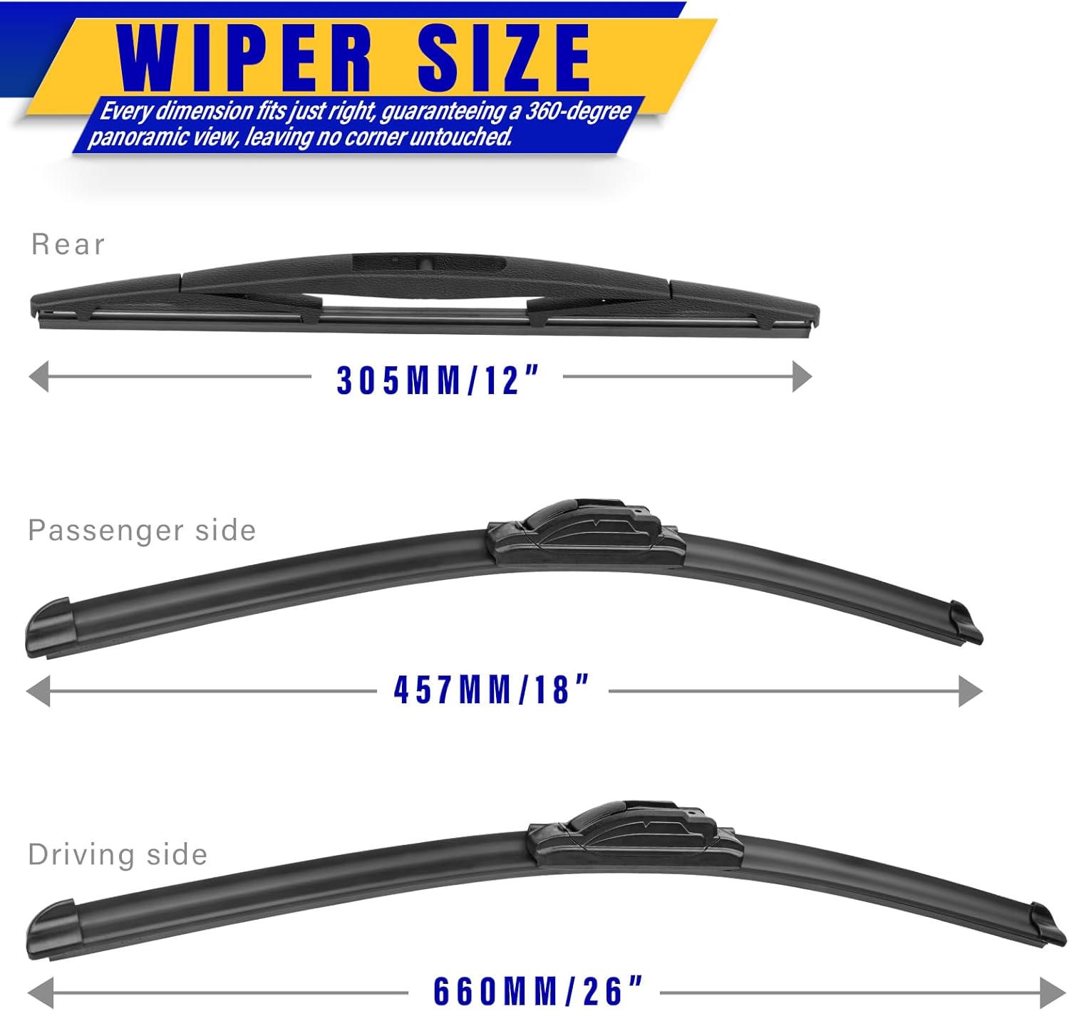 - 【WORRY-FREE SHOPPING】 3Pcs wiper blades 26"+18"+12" and Instruction Manual. One Year warranty! Refund or return anytime in one year, Long life, smooth engagement.