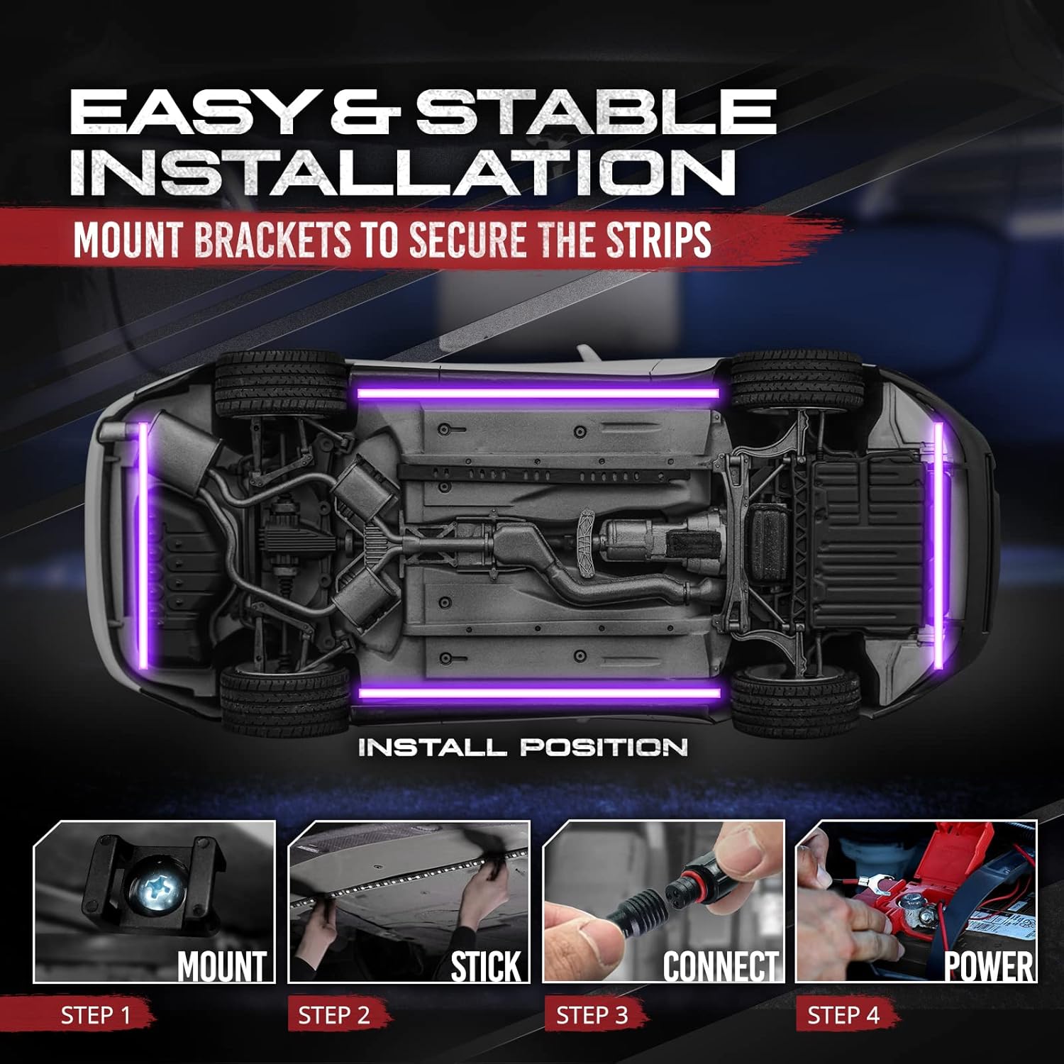 - [Easy Installation] With our exclusive design, the LED strips allow brightness at an output of more than 100% even in daylight, get ready to turn heads. Power up the light strips to positive and negative 12V battery terminals with our tested inline fuse power wire to prevent overdrawn on voltage.