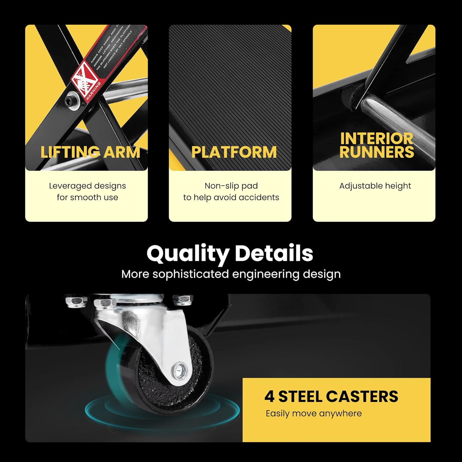 - MOVABLE & VERSATILE APPLICATION - The lift jack with dolly tray which has 4 steel casters can be easily move anywhere; It fits transmission and most motorcycle models like cruisers, trikes, Can Am Spyders, ATVs, UTVs, dirt bikes, snowmobiles, etc.; The portable design can save a lot of space, and you can put the stand in a small and compact space after use, such as a locker, corner, closet, garage, and so on