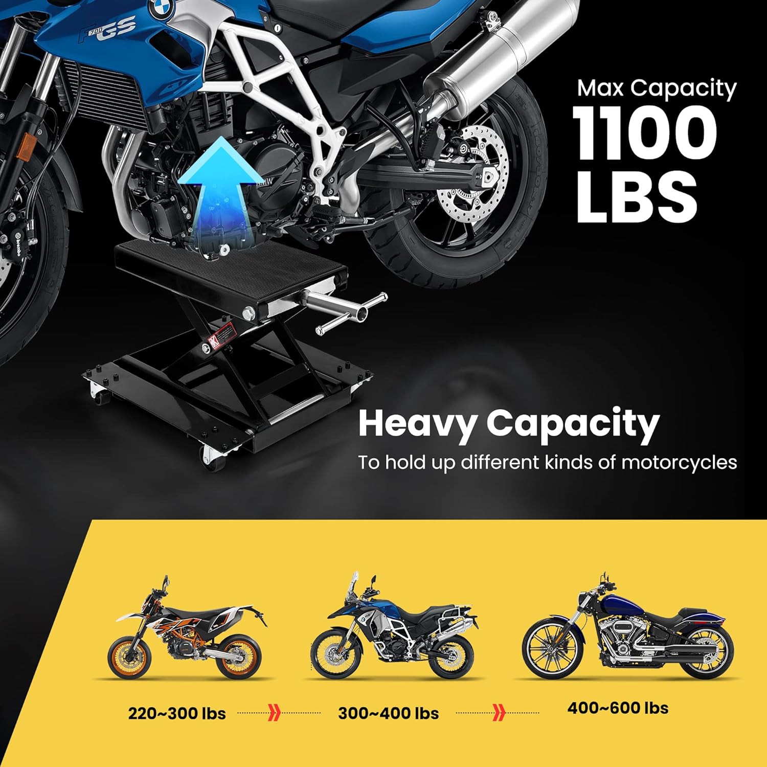 - HIGH PERFORMANCE - With a max load capacity of 1100 lbs., the lift jack can raise motorcycle to a comfortable level for your work between 5.1"-17.7" (with dolly) or 3.75"-14.95" (without dolly); The jack itself can be simply lifted out of the dolly tray and set on the ground; It is perfect to use in the garage, shop or at the track