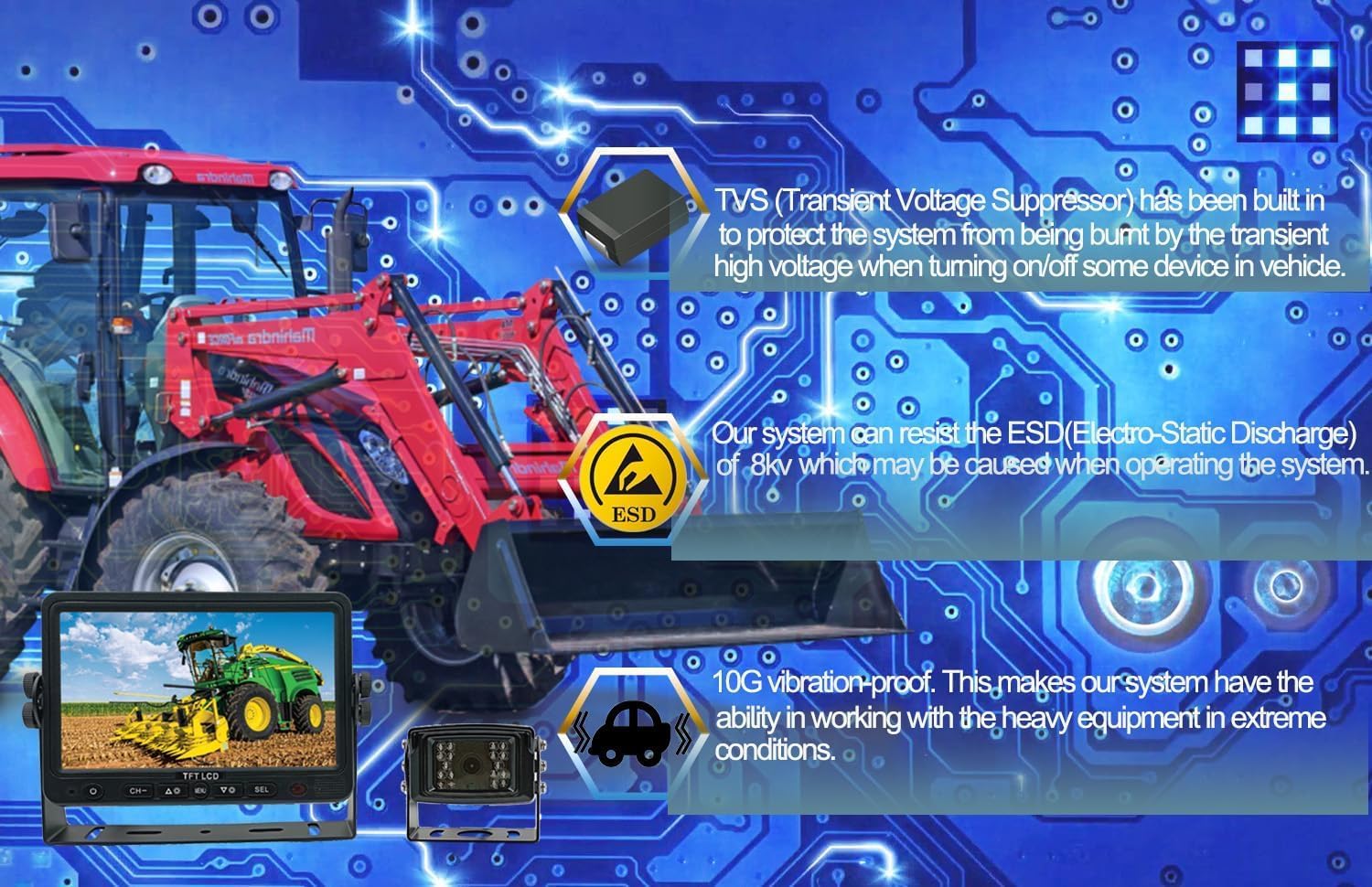 - Key Features:(1).Upgraded Industrial-Grade Chipset: Ensures reliable performance and durability for various vehicle. (2).10G Vibration Resistance: Withstand intense vibrations,making it ideal for heavy-duty vehicles and extreme conditions. (3).7” AHD 1080P Monitor: Delivers crystal-clear, high-definition visuals with 1080P resolution. (4).Heavy-Duty AHD 1080P Camera: Features a 120 degree viewing angle, IP69K waterproof rating and night vision for optimal performance in all weather conditions.