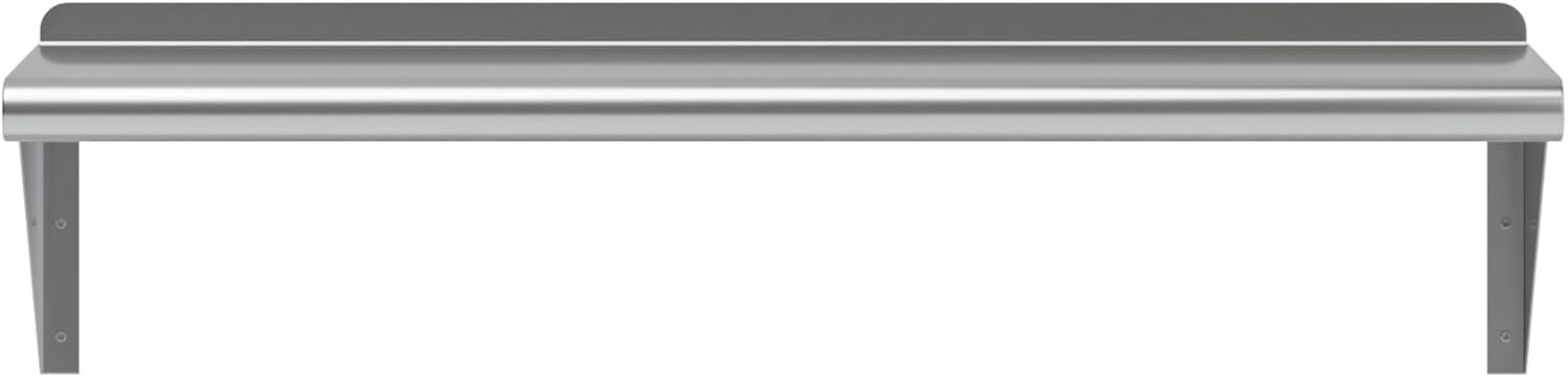 - 10 in. x 36 in. Stainless Steel Wall Shelf with 8 in. High Mounting Brackets. This heavy-duty multifunctional stainless wall shelf is made with 18 gauge stainless steel and can hold up to 195 Lbs of weight. The design features a 1 in. backsplash and bullnose edge. It's made with durable welded corners and support brackets.