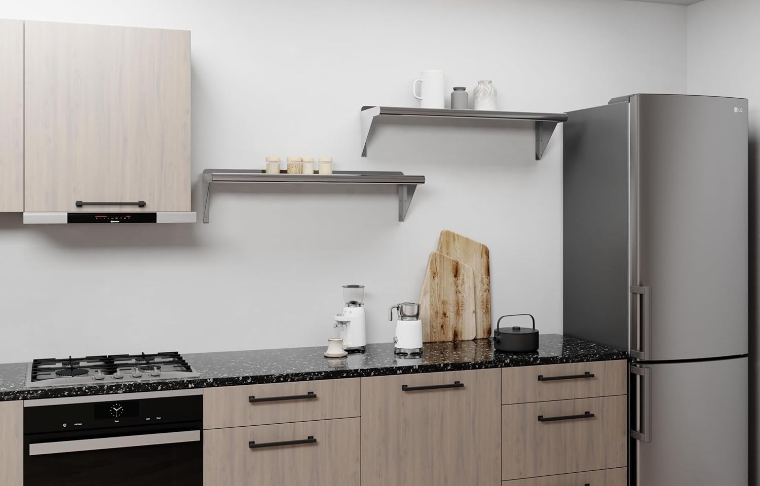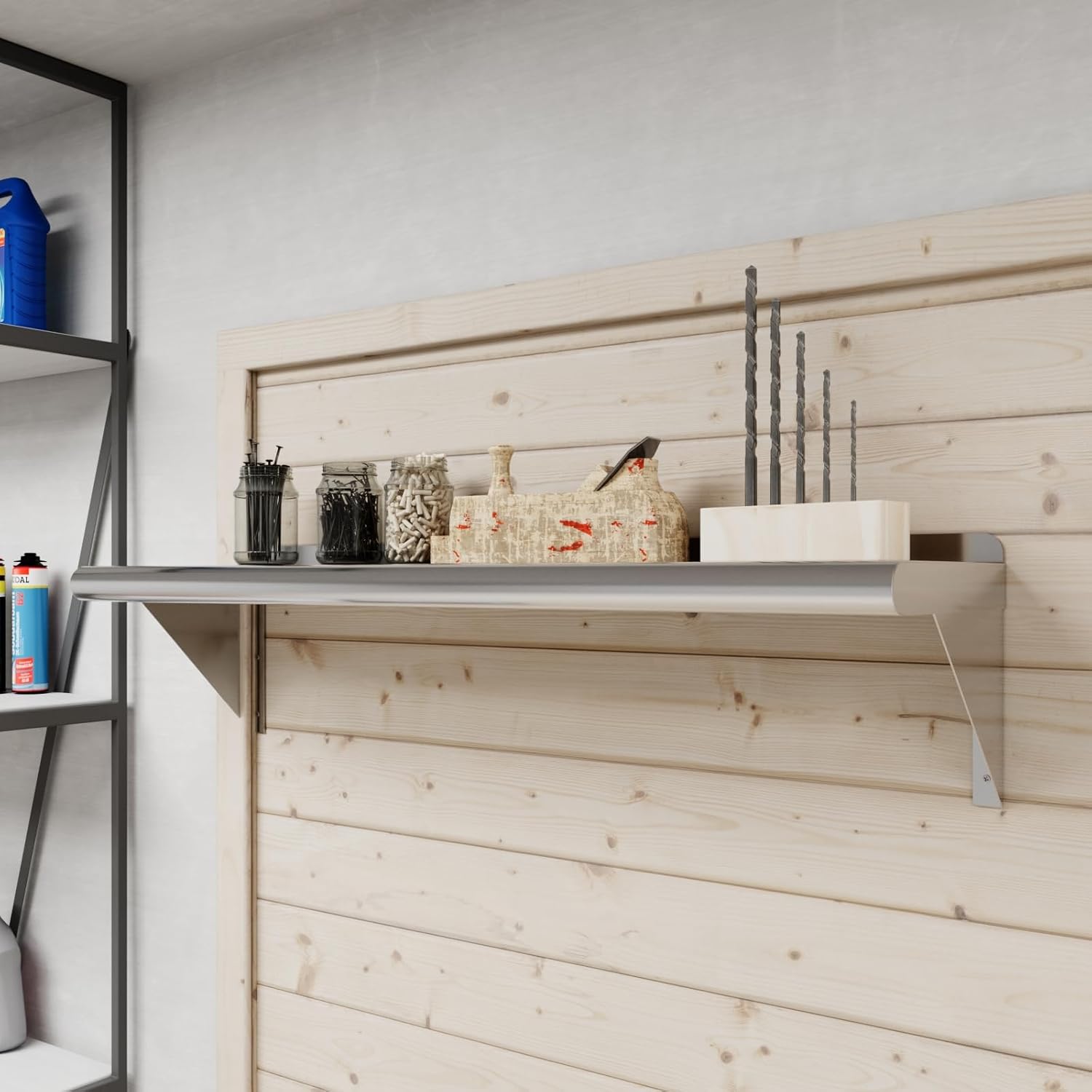 - This corrosion-resistant wall mount shelf can handle anything you throw at it and will last for years to come. Easy to clean and sterilize, metal shelves are superior to wood or glass. Food and liquid won’t get stuck or ruin the integrity of the surface. Easily wipe away excess with no fuss, mess, or contamination.
