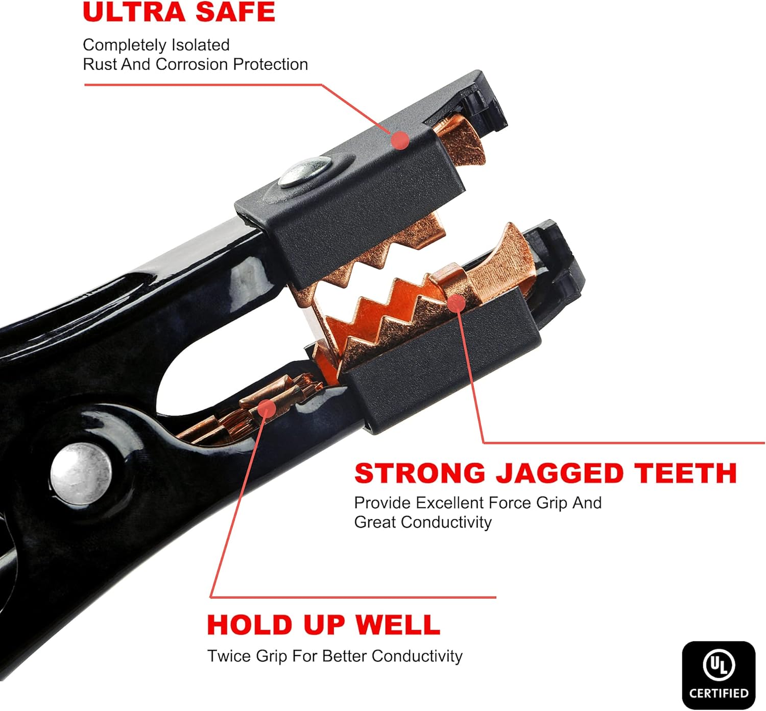 - Unique Design Strong Clamps - Industrial polypropylene made cover protects jaws from impacts (Unique Design), Also patented design clamps covered with non-conducting rubber, which make AWELTEC jumper cables more safe and durable for repeatedly use.