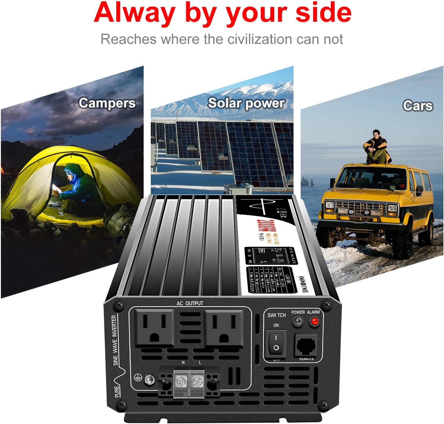 - 【2000W XIJIA Power Inverter】Provides clean pure sine wave 2000W DC 12V to AC 120V continuous power.Much better than Mod(modified) sine wave. True pure sine wave inverter can provide high quality and stable output power, Less wear to protect your AC equipment more stable.It's recommended by most cordless tool manufacturer that a pure sine wave inverter is used to ensure long battery life.