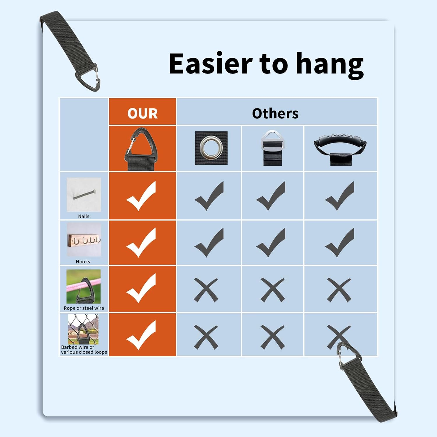 - Easy to Hang: Extension cord holder with triangle buckle can be hung on nails, hooks, ropes, Steel wire, Barbed wire and metal rings