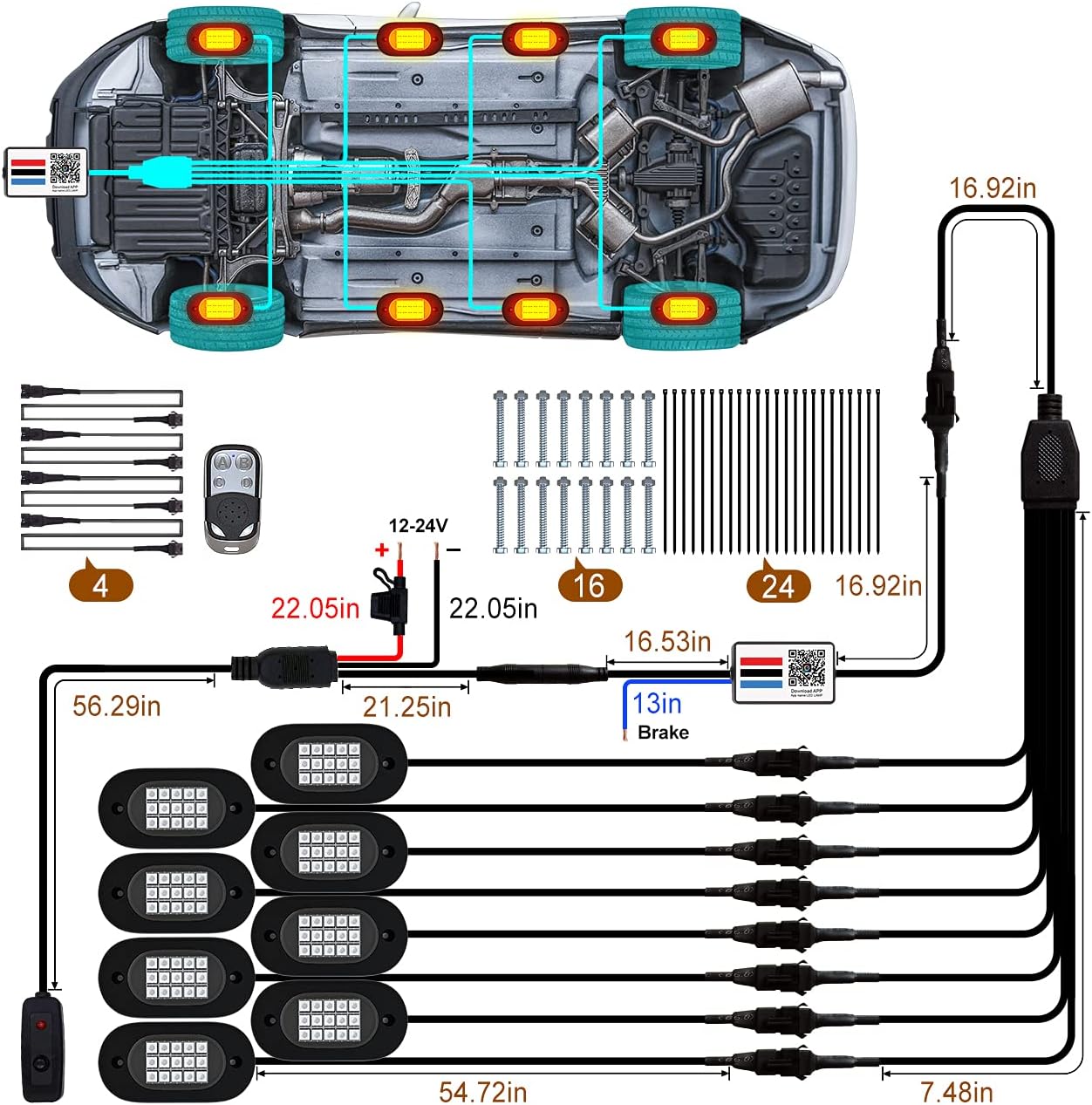 - [ RGB Multi-colors & Music Mode ] ➤ After install the APP, you can choose any color as your need, and each pod have a 150° super wide-angle lights. The underglow lights kits will dance to the rhythm of your music, including relaxing tunes, slow and dance music, enjoy every moment of your favourite music when you are driving.