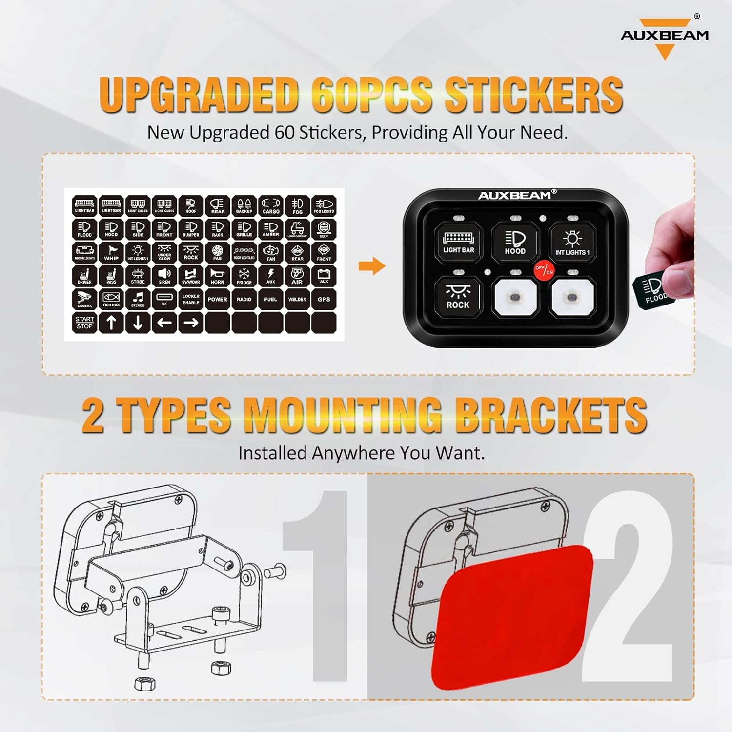 - PACKAGE INCLUDE: 1 x switch control box, 1 x switch panel, 1 x mounting bracket, 1 x double-sided adhesive mounting tape, 1 x wiring harness, 1x 60pcs DIY stickers, 10 x zip ties, 1 x Installation Instruction. If you have any problems, please feel free to contact us, and we will provide you with perfect after-sales service! The product comes with a 2-year protection provided by Auxbeam