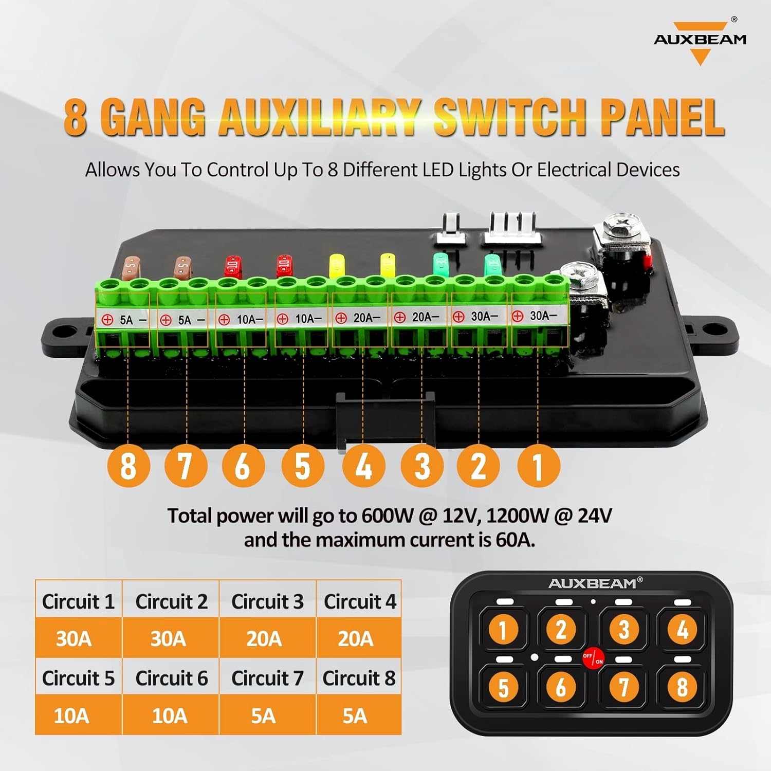 - AUXBEAM 8 GANG SWITCH: Offers a perfect solution to clean up all wiring harness and add a single panel to control everything. This switch pod with 8 circuits can power all types of 12V/24V accessories, Max power rating: 1200W. Max current rating: 60A, Operating temperature: -40℉~221℉