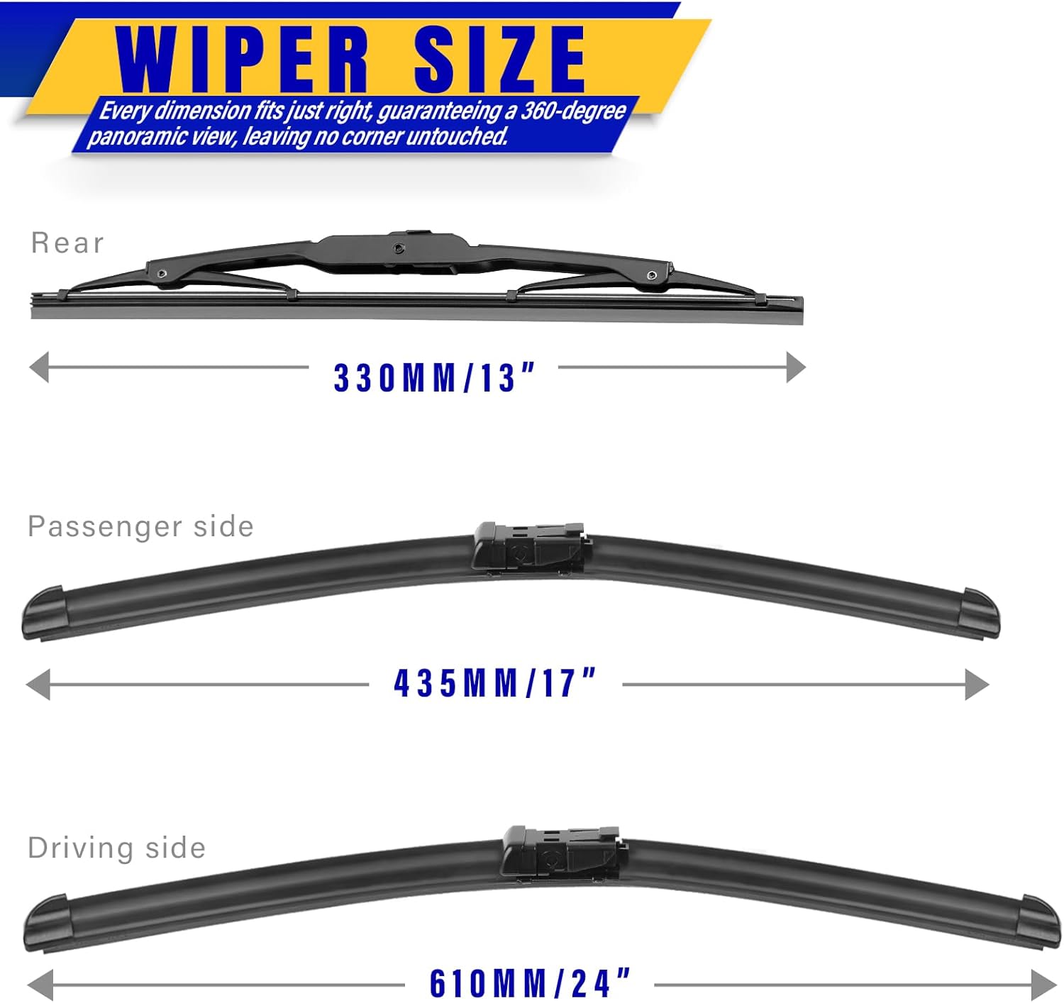 - 【WORRY-FREE SHOPPING】 3Pcs wiper blades 24"+17"+13" and Instruction Manual. One Year warranty! Refund or return anytime in one year, Long life, smooth engagement.