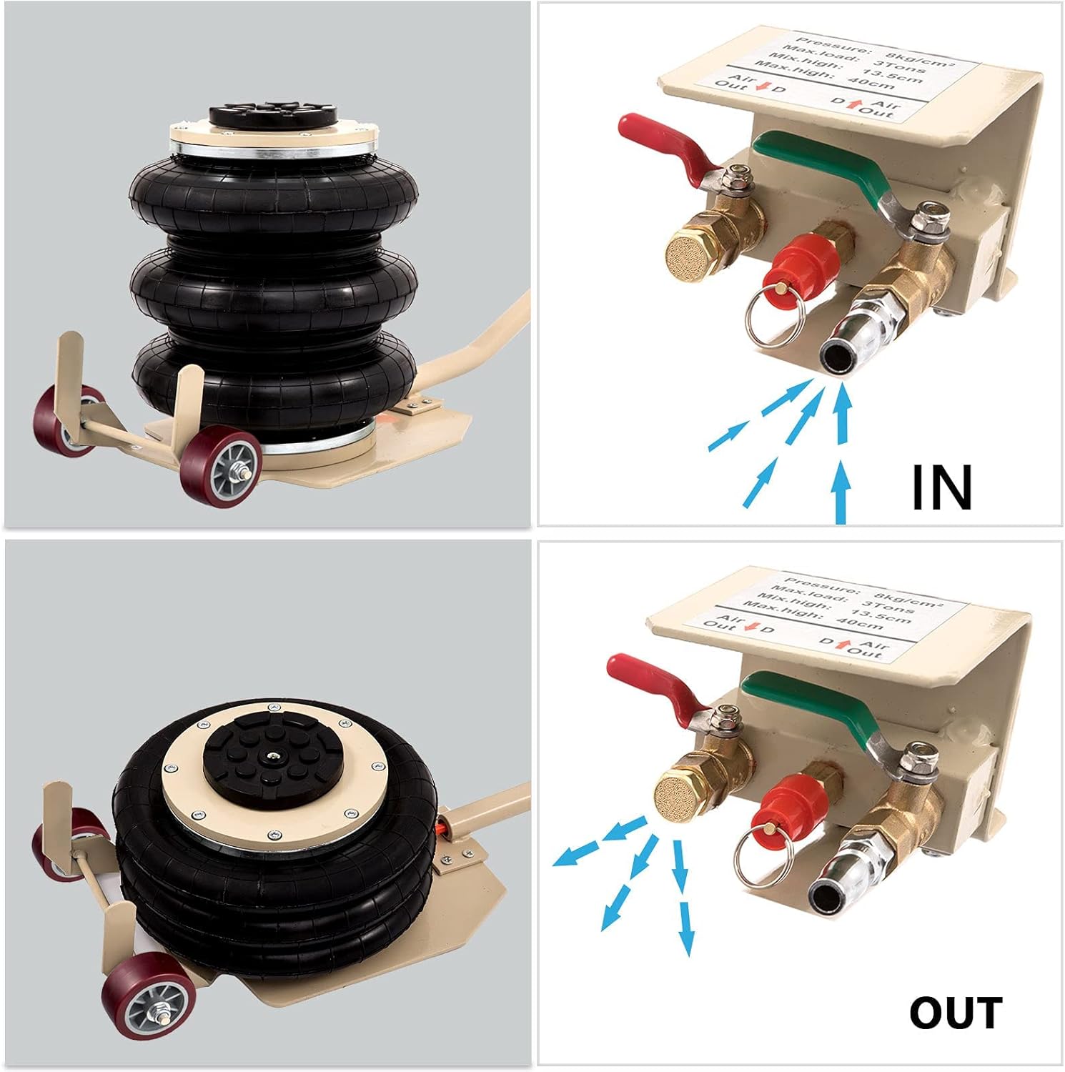 - Quick Up and Down : It only takes about 3-5 seconds with an internal telescopic stabilizer for the car to rise, which is time-saving. You can control how fast it inflates with the valve. The exhaust valve is throttled to make it deflated slowly and safely