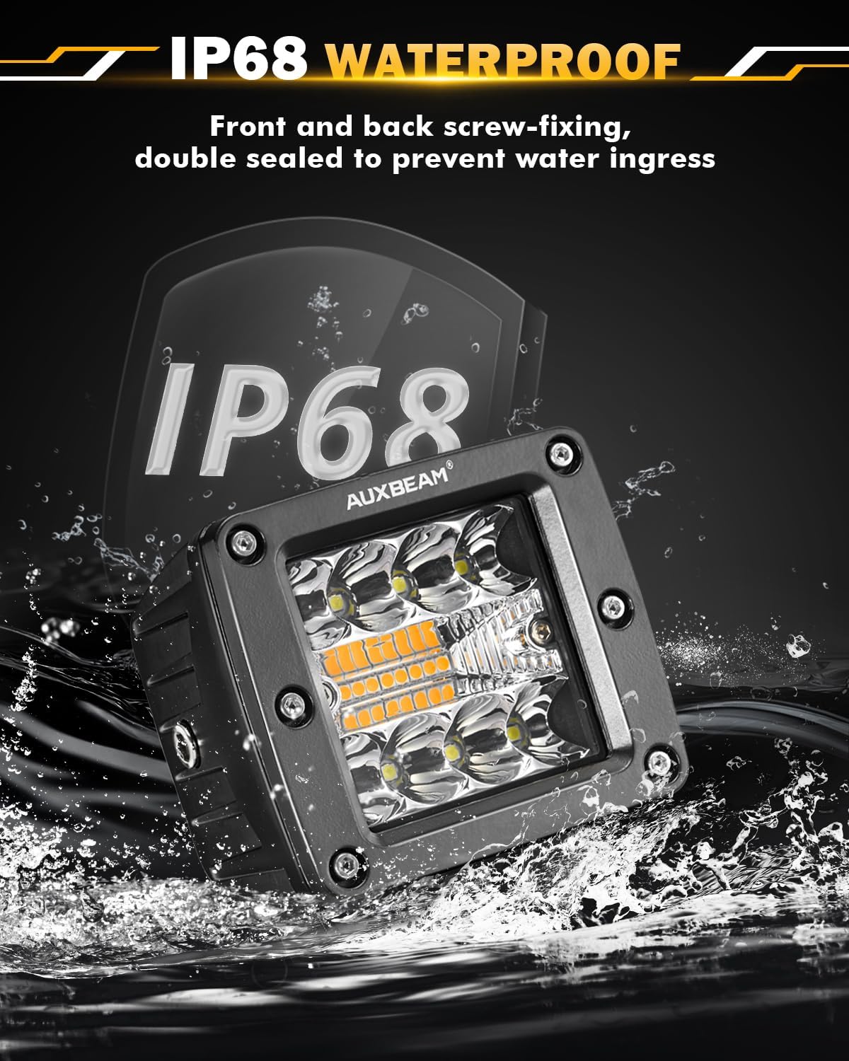 - 【UPGRADE 6 LIGHTING MODES】Auxbeam 3 inches cube light pod with custom wiring harness kit is very suitable for off road lights, warning lights, fog lights, driving lights or work lights. You can switch between 6 driving modes through our remote control: white driving light, amber fog light, white and amber combo light, white flashing light, amber flashing light, white and amber strobe lights