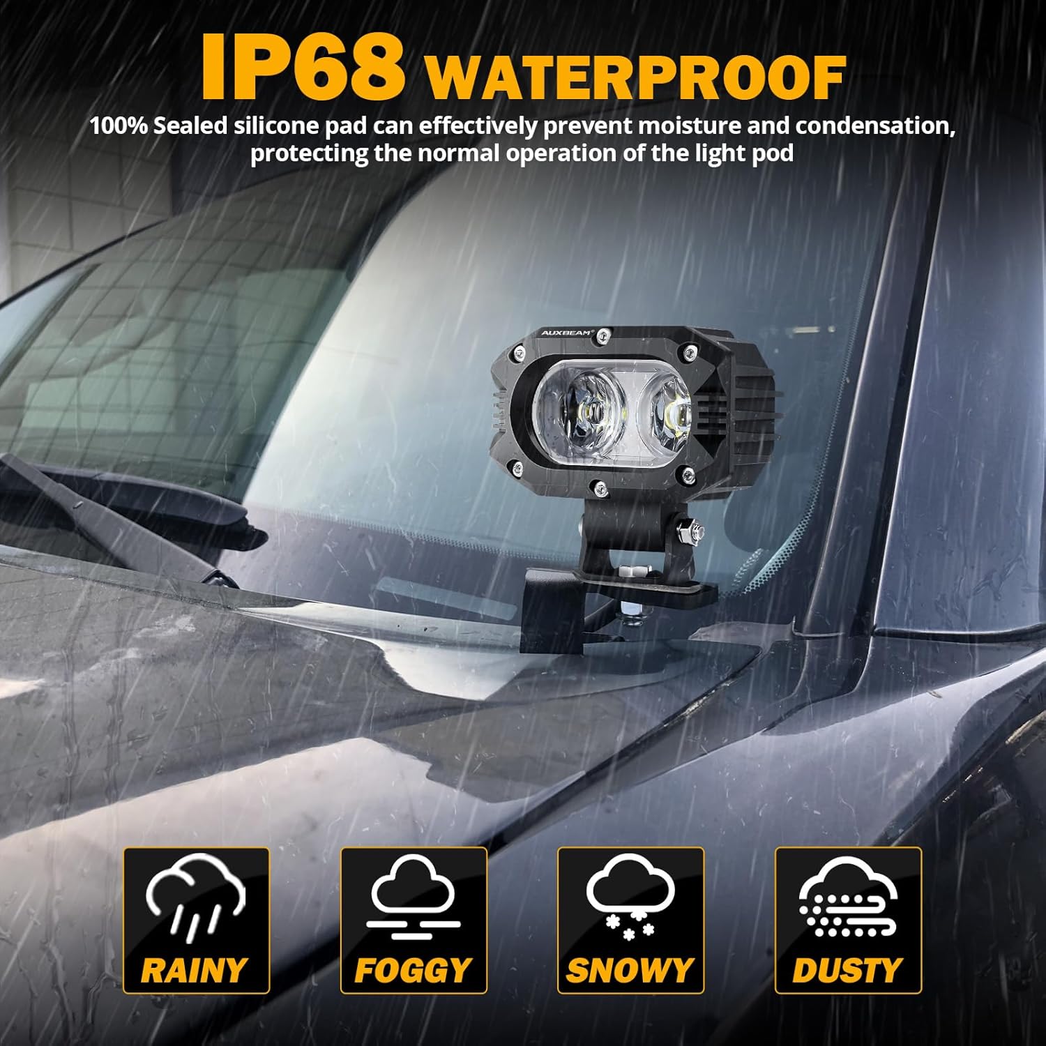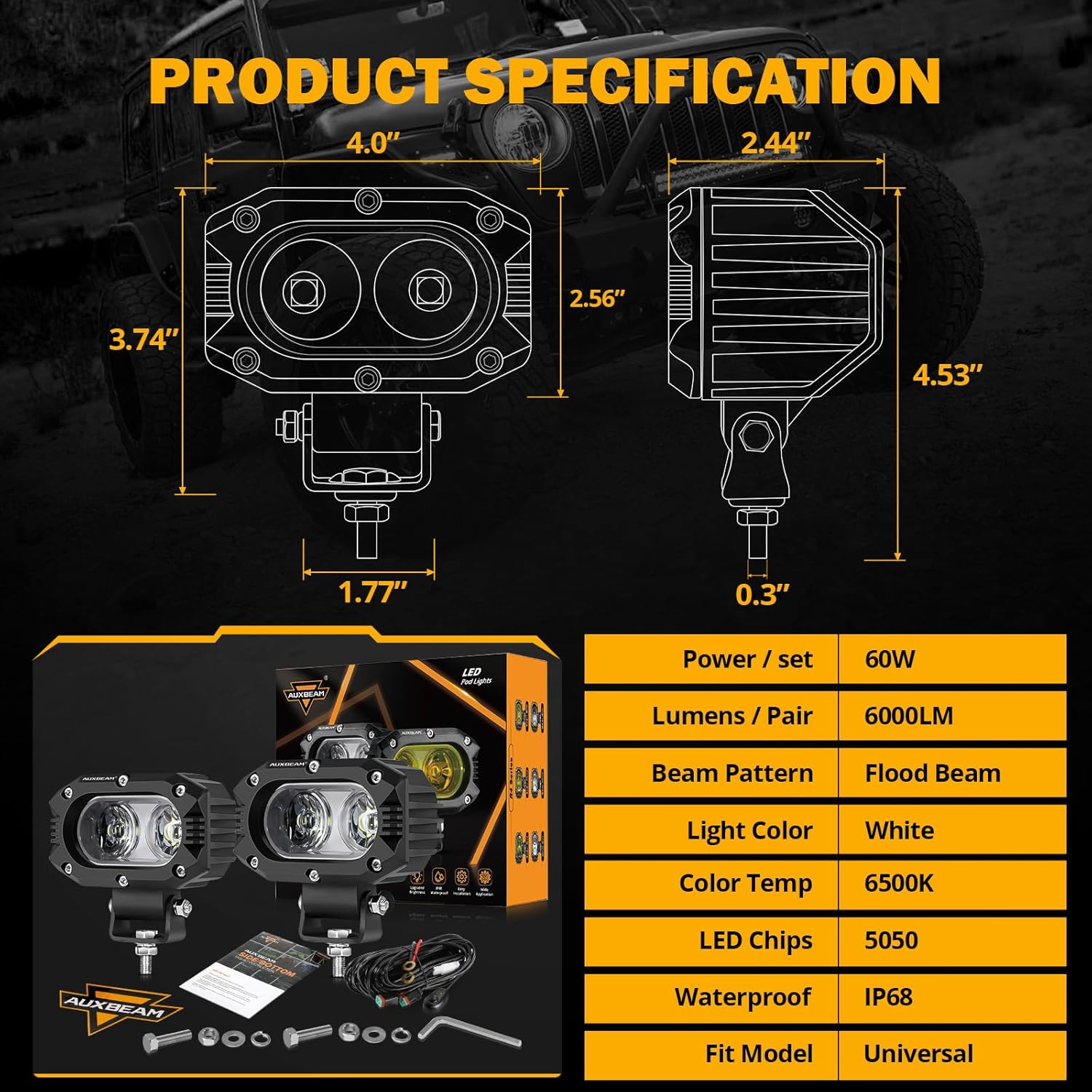 - 【Upgraded corrugated 12D lens design】Auxbeam 4-inch new LED driving light is upgraded from the original floodlight to a new designed industrial 12D optical corrugated lens. The broad flood lights can creat 6000LM super bright white beam, which can emit Longer and wider lighting. With a 60W high-intensity 5050 LED chip, it can provide a better day and night visibility, allowing you to drive safely