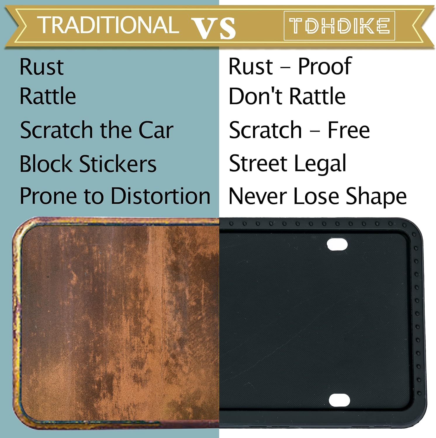 - Humanized design: Our automotive license plate frames have 8 drainage holes to release water. And allow rain, ice, and snow to easily seep out, ensuring your plates stay rust and tarnish free.