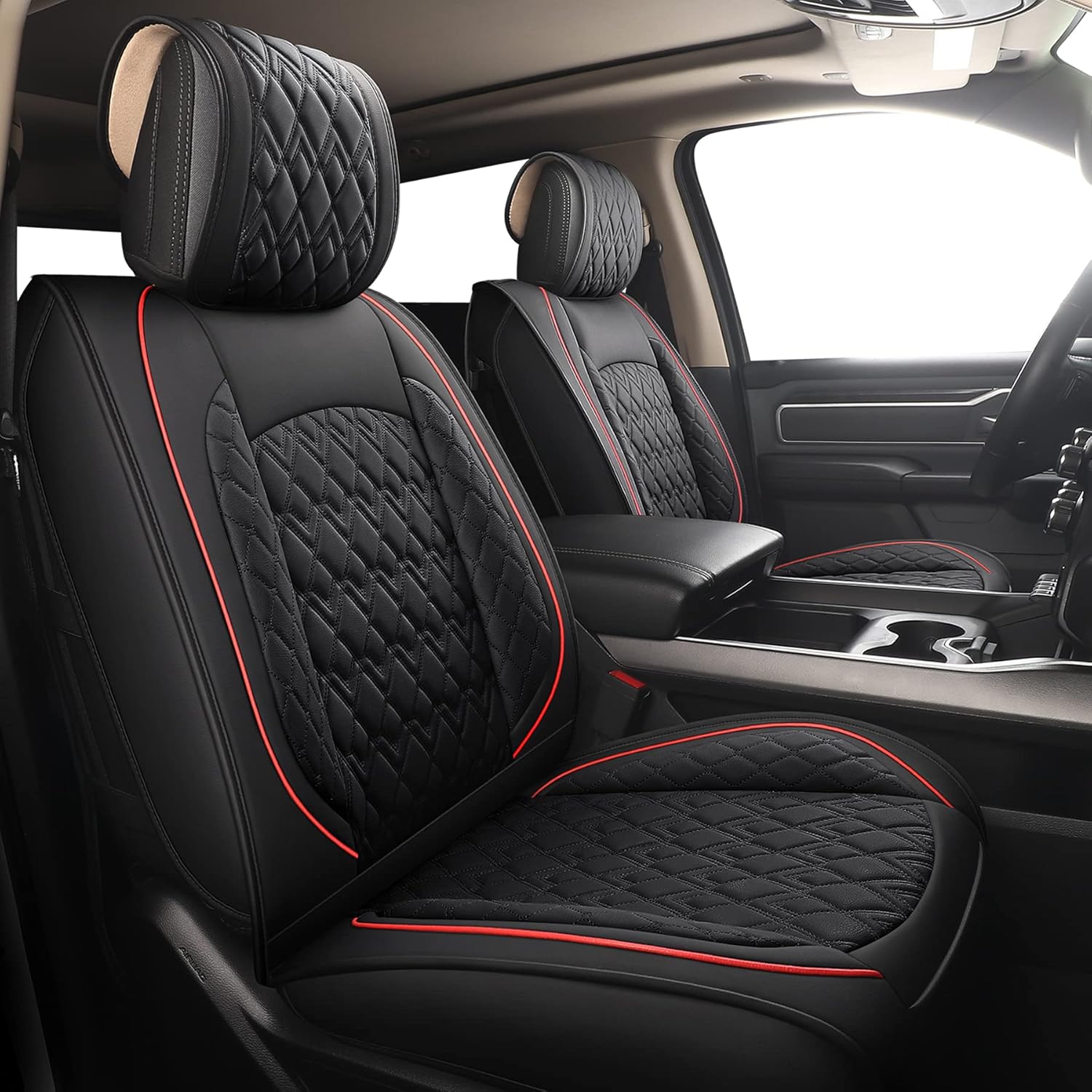 JOJOBAY Car Seat Covers for Dodge Ram 2 Pcs Front,Fit Ram 2009-2025 1500/2500/3500 Pick-up Truck,Crew,Regular,Quad,Mega Cab,Waterproof Leather Seat Covers Protectors(2 PCS Front,Black/Red)